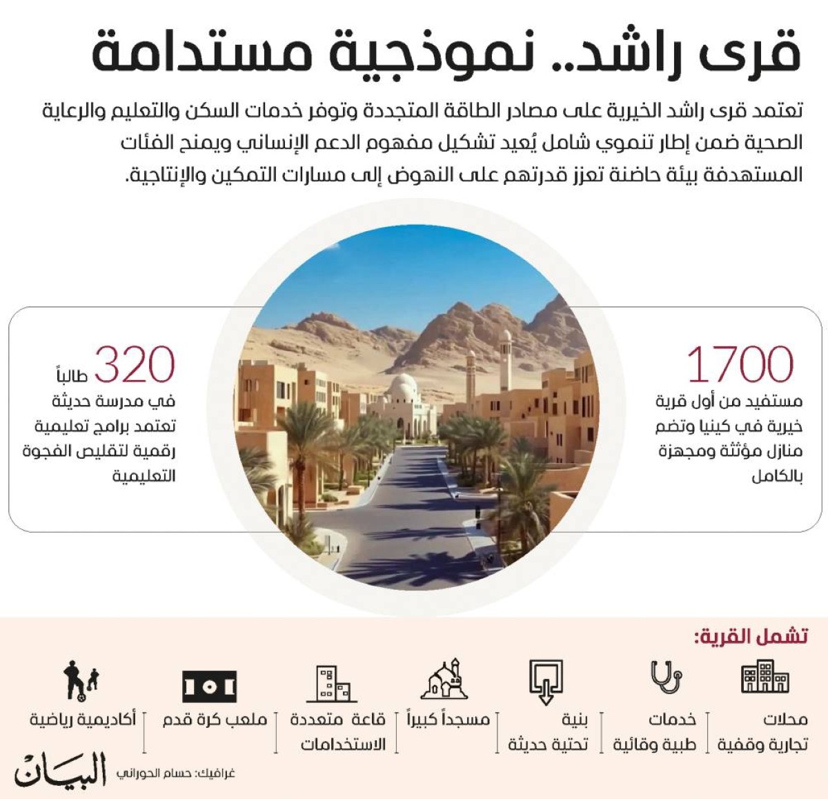 وتنطلق المرحلة الأولى من المشروع من جمهورية كينيا، حيث سيتم بناء أول قرية من «قرى راشد» على مساحة 72 دونماً (7.2 هكتارات) وفق أسس مستدامة تراعي استخدام مصادر الطاقة المتجددة، بما يوفّر للأُسر المستفيدة حياة كريمة ويمنحها القدرة على استعادة دورها في مجتمعاتهم والمشاركة في بناء مستقبل أفضل.