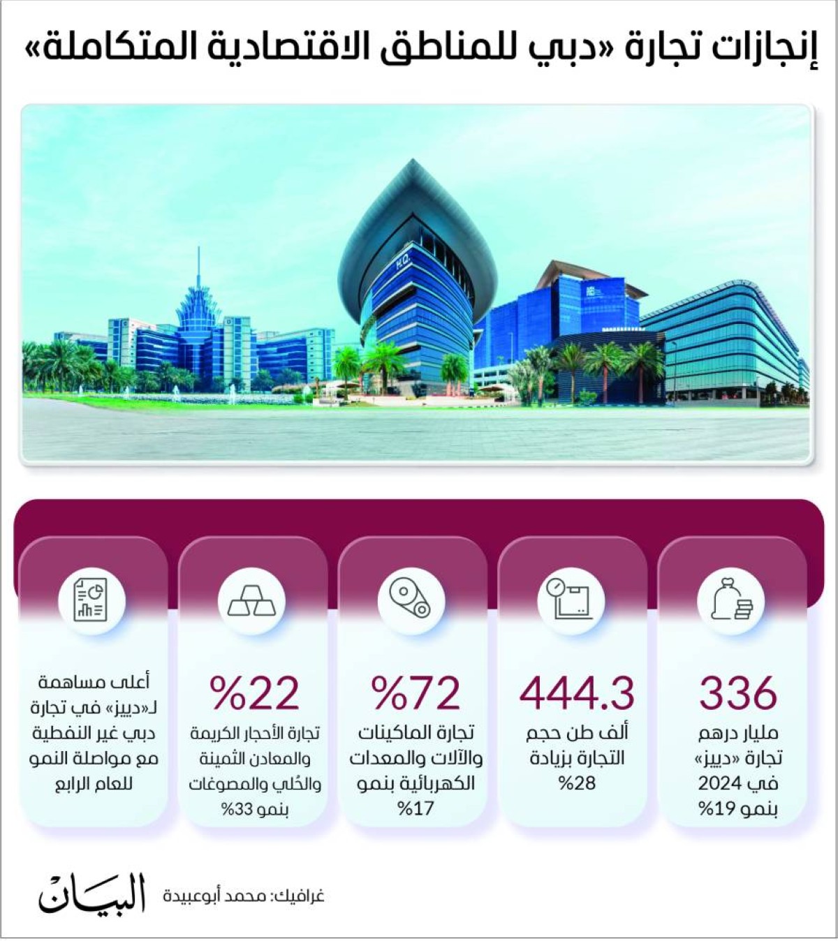 من جانبه، قال الدكتور محمد الزرعوني، الرئيس التنفيذي لسلطة دبي للمناطق الاقتصادية المتكاملة «دييز»: «النتائج الاستثنائية التي سجلتها «دييز» خلال عام 2024، وما تحققه من نمو شامل وإنجازات متميزة ومتتالية من خلال مناطقها الاقتصادية الثلاث، تدفعنا نحو تحقيق المزيد من الإنجازات المشرفة عاماً بعد عام، واستكمال مسيرة التقدم والابتكار في جميع المناطق الاقتصادية العاملة تحت مظلة السلطة، بما يعزز تنافسية دبي على خريطة التجارة العالمية».