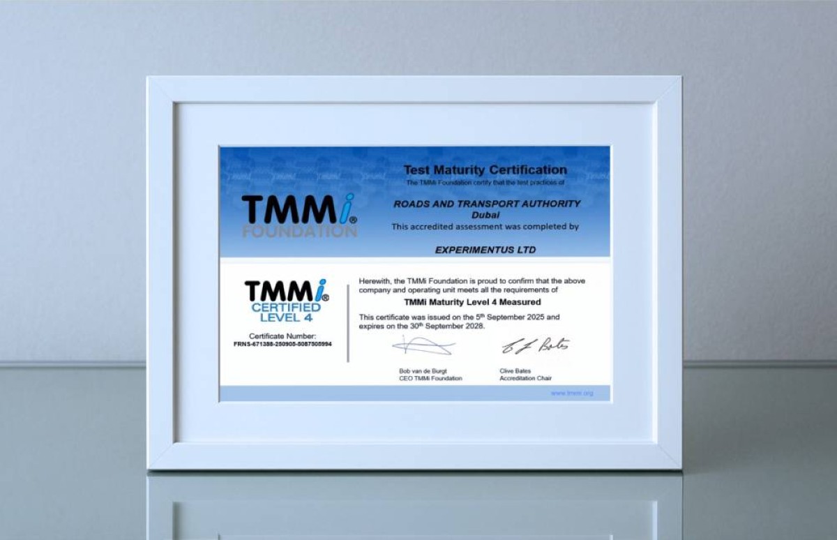 حققت هيئة الطرق والمواصلات في دبي إنجازاً عالمياً بحصولها على شهادة "تكامل نموذج نضج اختبار التقنيات" (TMMi) من المستوى الرابع، لتصبح بذلك أول مؤسسة في دولة الإمارات العربية المتحدة، والأولى في قطاع النقل والمواصلات على مستوى العالم تنال هذا الاعتراف.
