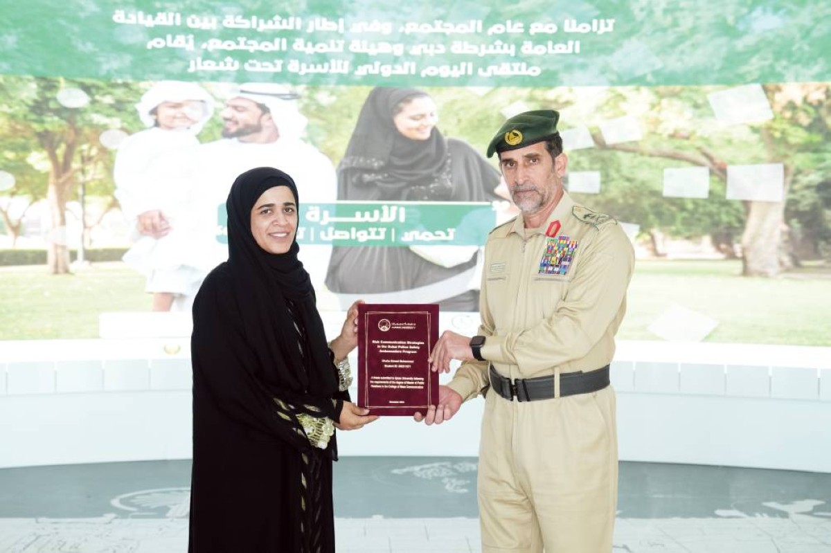 تسلم معالي الفريق عبدالله خليفة المري، القائد العام لشرطة دبي، رسالة ماجستير في العلاقات العامة، من الملازم ضحى أحمد محمد، والتي جاءت بعنوان «استراتيجيات التواصل بشأن المخاطر عبر مبادرة سفراء الأمان في شرطة دبي».