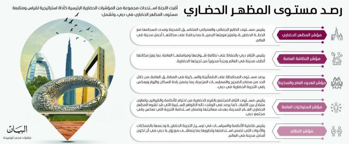 وانطلاقاً من رؤية اللجنة في بناء منظومة متكاملة تضمن استدامة التجربة الحضرية في دبي، تم استحداث مجموعة من المؤشرات الحضارية التي تشكل أداة استراتيجية لقياس ومتابعة مستوى المظهر الحضاري في الإمارة، وتقييم مدى انعكاس القيم والسلوكيات الإيجابية على تفاصيل الحياة اليومية في المدينة.