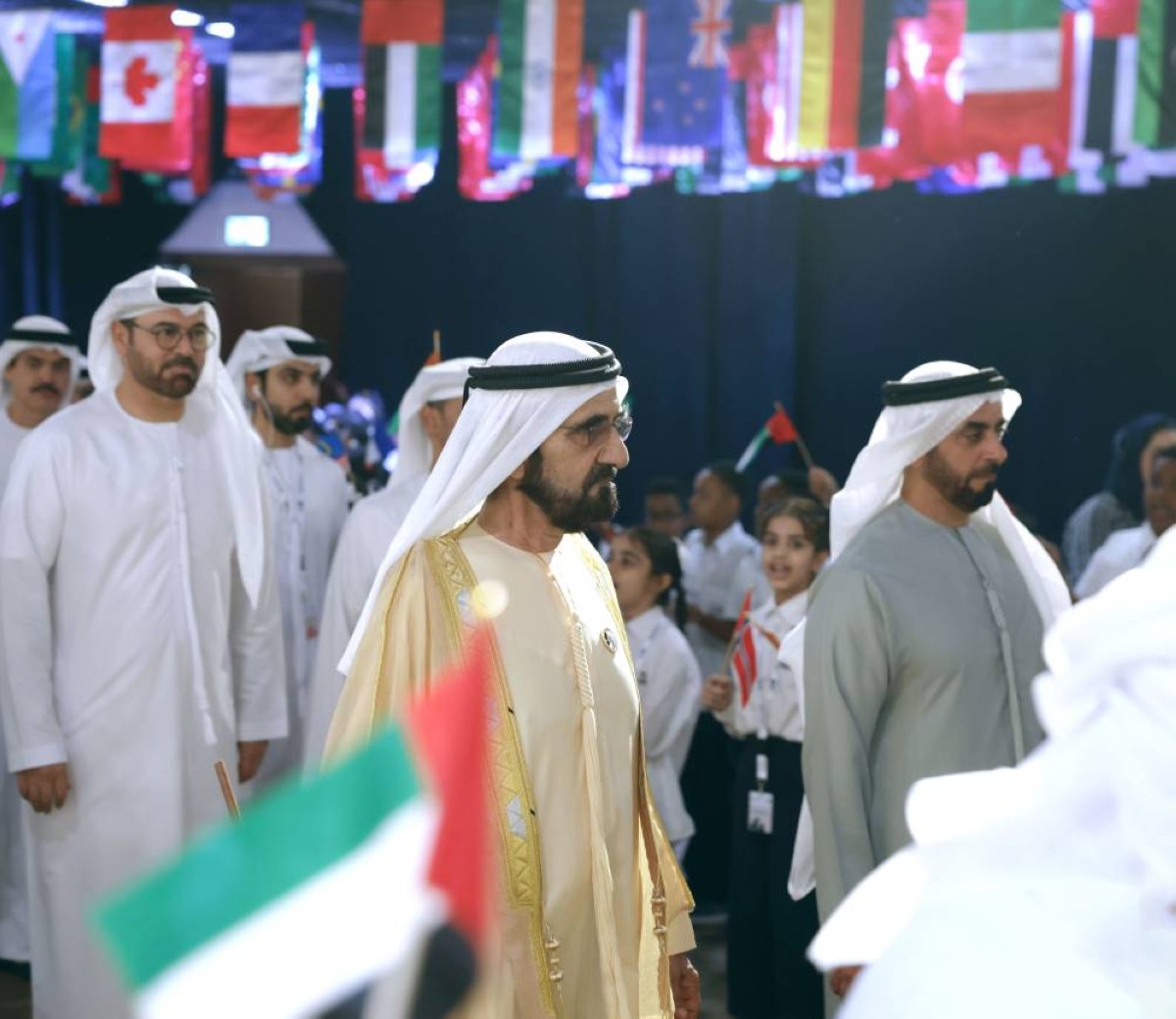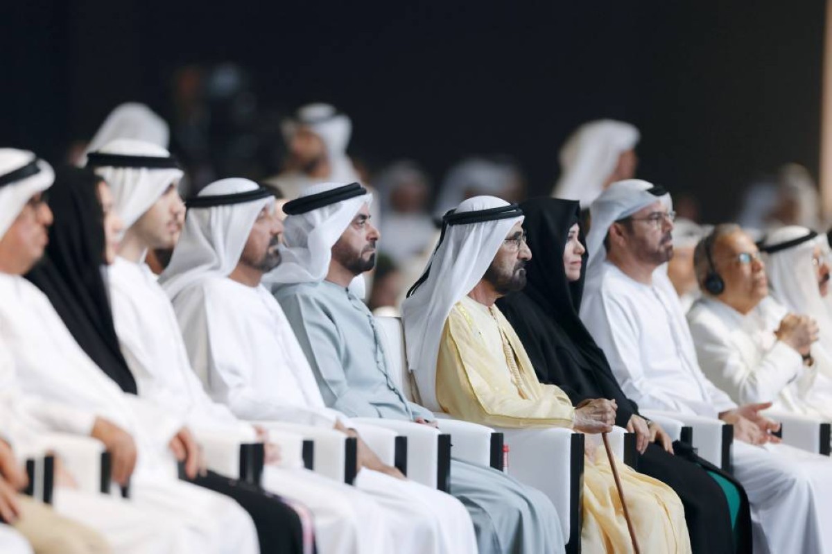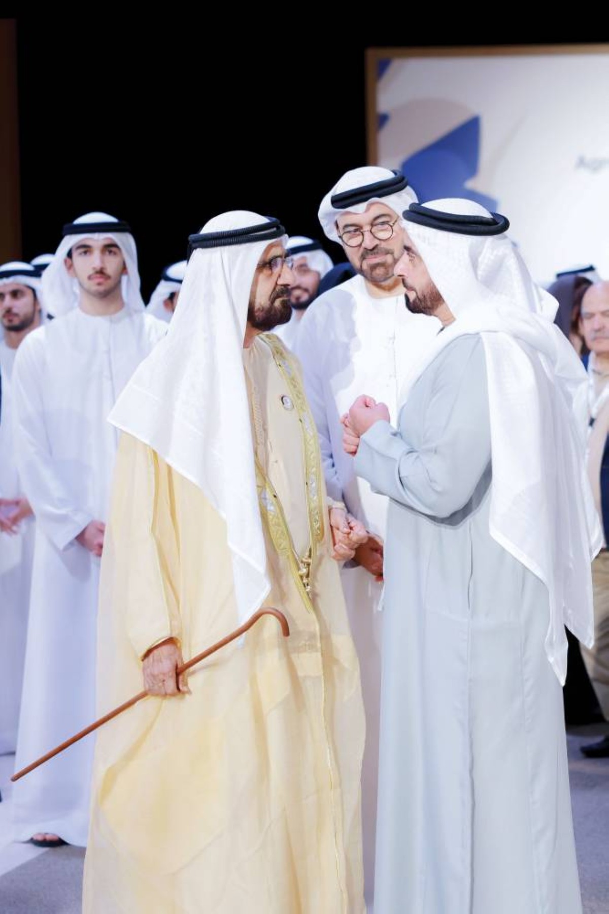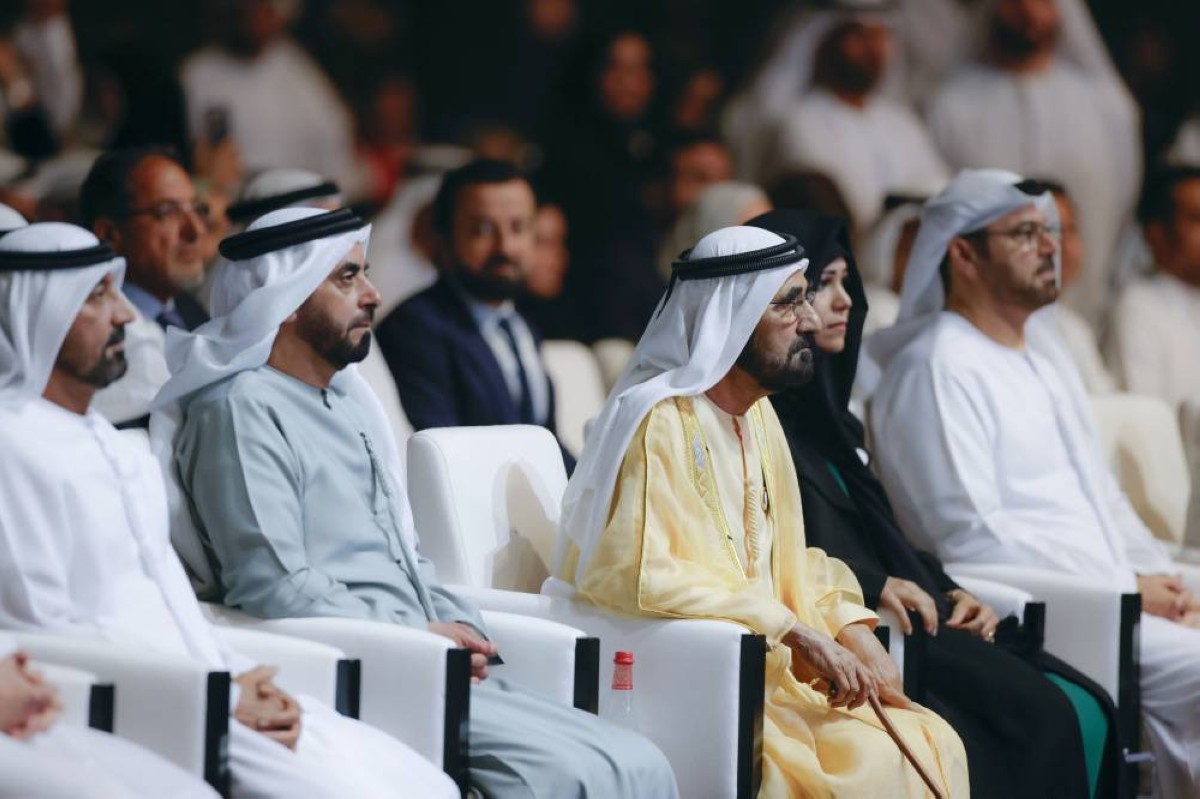 محمد بن راشد خلال الحفل بحضور سيف بن زايد وأحمد بن سعيد ولطيفة بنت محمد ومحمد بن راشد بن محمد ومحمد القرقاوي وعدد من المسؤولين والمدعوين
