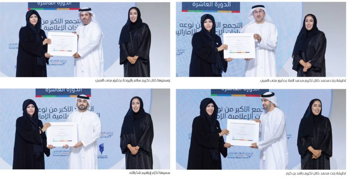 وشمل تكريم المؤسسات الإعلامية الإماراتية أيضاً كلاً من منصة دبي بوست، وتسلّم التكريم سالم باليوحة، المدير التنفيذي لقطاع المحتوى الإعلامي بمؤسسة دبي للإعلام، ومجموعة برق الإمارات، وتسلّم التكريم سلطان خالد صفر، مسؤول إدارة العمليات، وشبكة عميد الإمارات.