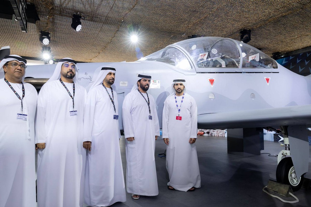 واستمع سموّ ولي عهد دبي نائب رئيس مجلس الوزراء وزير الدفاع إلى شرح حول الطائرة الخفيفة متعددة الاستخدامات، والتي تم تصميمها لتنفيذ مهام قتالية متنوعة تشمل الدعم الجوي القريب والمراقبة والاستطلاع، ويمكنها التحليق لمدة 12 ساعة متواصلة، كما روعي في تصميمها أن تكون مناسبة للاستخدام في عمليات تدريب الطيارين.