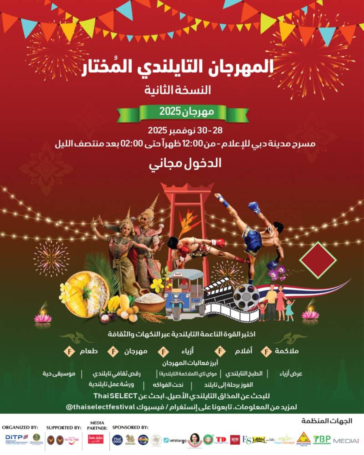 يعود مهرجان تاي سيليكت 2025 بنسخته الثانية ليضيء مسرح مدينة دبي للإعلام من جديد، في الفترة من 28 إلى 30 نوفمبر 2025، حيث يستقبل الجمهور يوميًا من الساعة 12 ظهرًا حتى 2 فجرًا. ثلاثة أيام تنبض بمشاهد وأصوات ونكهات تايلاند الأصيلة، لتعيد إلى دبي أجواءً مليئة بالبهجة والاحتفال .ويُنظَّم هذا الحدث المجاني من قبل المركز التجاري التايلاندي في دبي التابع لإدارة ترويج التجارة الدولية بوزارة التجارة في الحكومة الملكية التايلاندية، ليقدّم تجربة فريدة تستعرض “القوة الناعمة” التايلاندية عبر خمسة عناصر أساسية: المأكولات، المهرجانات، الأزياء، الأفلام، والفنون القتالية .ويهدف المهرجان إلى تعزيز الروابط الثقافية بين تايلاند ودولة الإمارات العربية المتحدة، وتسليط الضوء على الاقتصاد الإبداعي التايلاندي وجاذبية المملكة كوجهة عالمية تنبض بالحياة والإلهام.