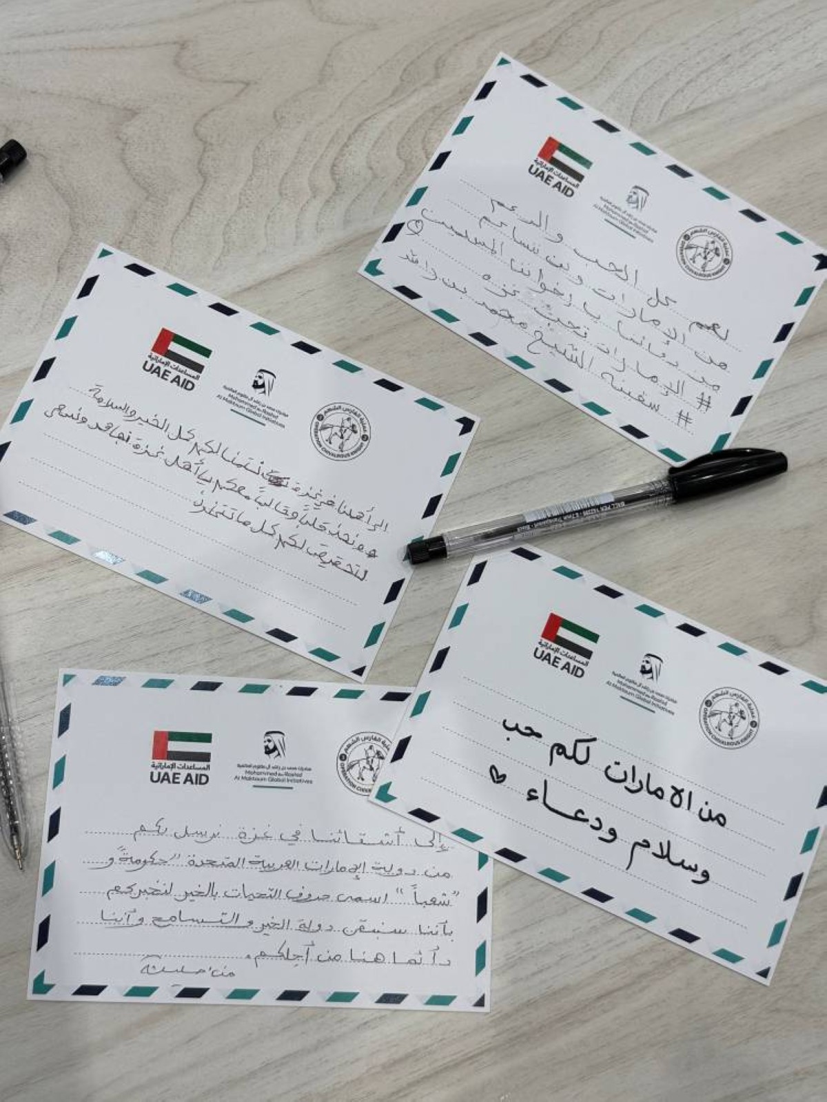 ومن بين العبارات التي دونها الطلاب على البطاقات: «من الإمارات لكم حب وسلام ودعاء»، و«إلى أهلنا في غزة.. نتمنى لكم كل الخير والسلامة، ونحن قلباً وقالباً معكم نسعى ونجاهد لتحقيق كل ما تتمنونه».