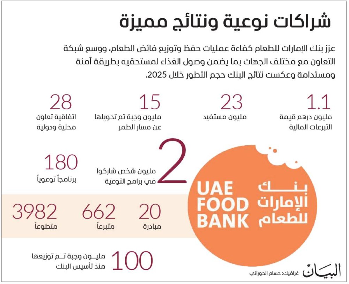 وقد أبرز البنك خلال الحفل مجموعة من النتائج التي تعكس حجم التطور الذي شهده خلال عام 2025، إذ بلغ عدد المستفيدين من وجبات فائض الطعام التي جرى توفيرها بالتعاون مع المؤسسات الغذائية أكثر من 23 مليون شخص، كما بلغت قيمة التبرعات المالية التي تسلمها البنك نحو مليون ومئة ألف درهم. ونفّذ البنك خلال العام برامج توعوية وتثقيفية متخصصة شارك فيها أكثر من مليوني شخص، إلى جانب 20 مبادرة ونشاطاً ضمن خطة العمل السنوية التي شهدت مشاركة واسعة من المتطوعين والمتبرعين. كما وقع البنك 28 اتفاقية تعاون مع جهات محلية وإقليمية ودولية، هدفت إلى توسيع شبكته وتعزيز قدرته على الوصول إلى المجتمعات المحتاجة. ومنذ تأسيسه، نجح البنك في توزيع أكثر من 100 مليون وجبة بفضل شراكاته الاستراتيجية وتوسع عمليات الحفظ والتوزيع.