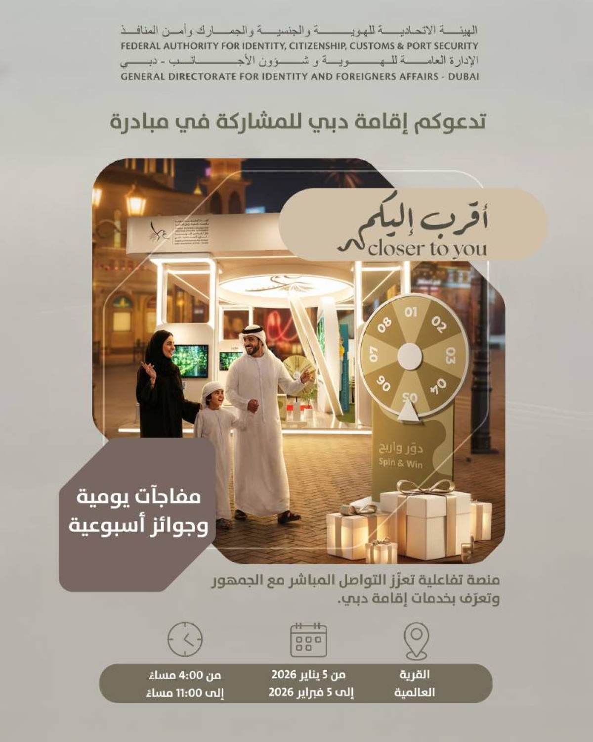 وتتميز منصة المبادرة بطابعها التفاعلي الموجه لجميع أفراد العائلة، حيث تقدم أنشطة وتجارب تفاعلية وألعاباً هادفة، إلى جانب مفاجآت يومية وسحوبات على جوائز أسبوعية، في تجربة مجتمعية متكاملة، تهدف إلى تعزيز التواصل الإيجابي، وترسيخ حضور إقامة دبي بصورة قريبة ومباشرة من أفراد المجتمع.