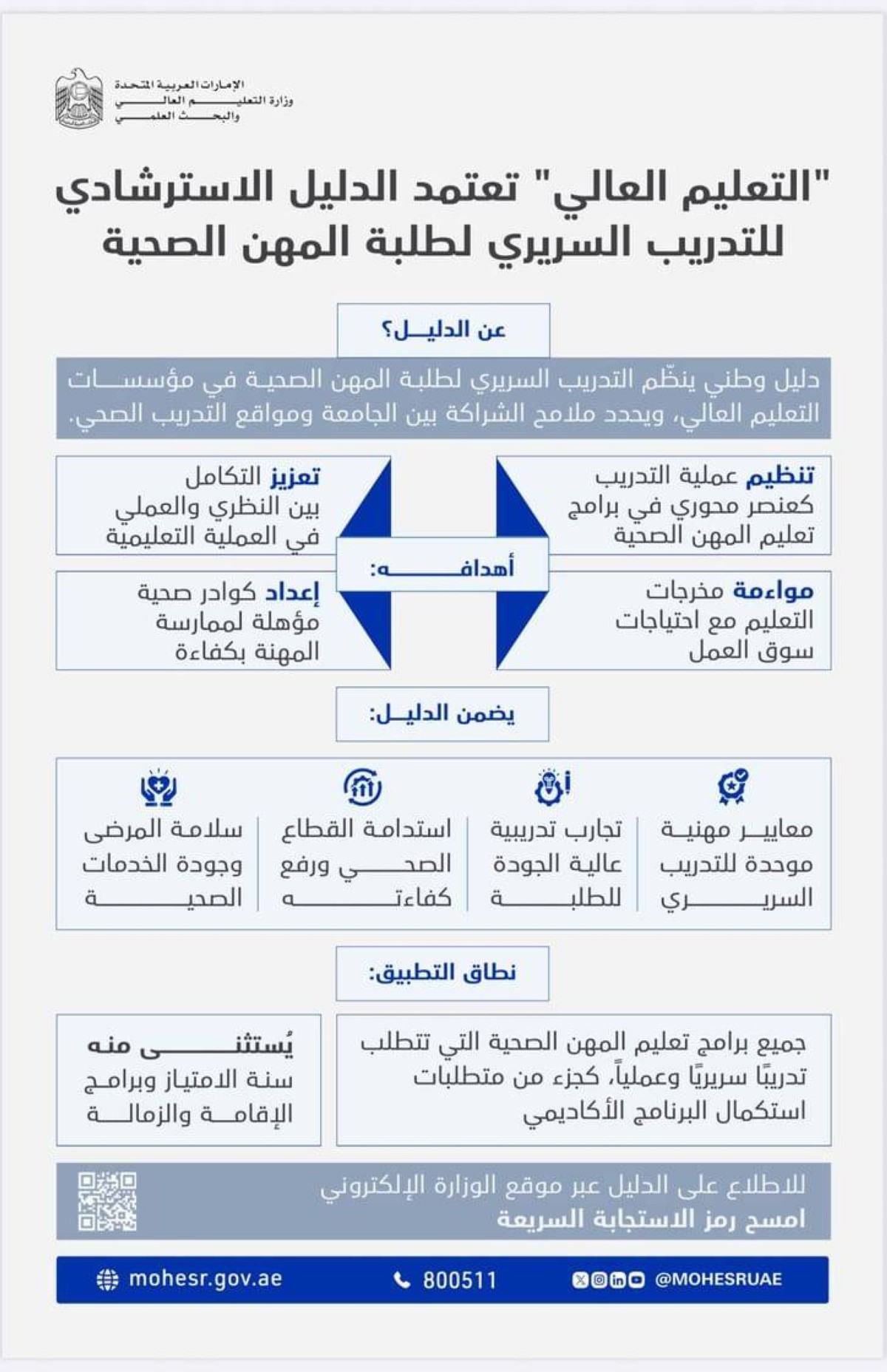 اعتمدت وزارة التعليم العالي والبحث العلمي بالتعاون مع وزارة الصحة والمعهد الوطني للتخصصات الصحية، الدليل الاسترشادي للتدريب السريري، الخاص بطلبة التعليم العالي، والذي يحدد المتطلبات الأساسية والتوقعات من إقامة شراكات فعالة بين مؤسسات التعليم العالي، ومواقع التدريب السريري، بما يضمن تقديم تجارب تعليمية وعملية عالية الجودة لطلبة برامج المهن الصحية.