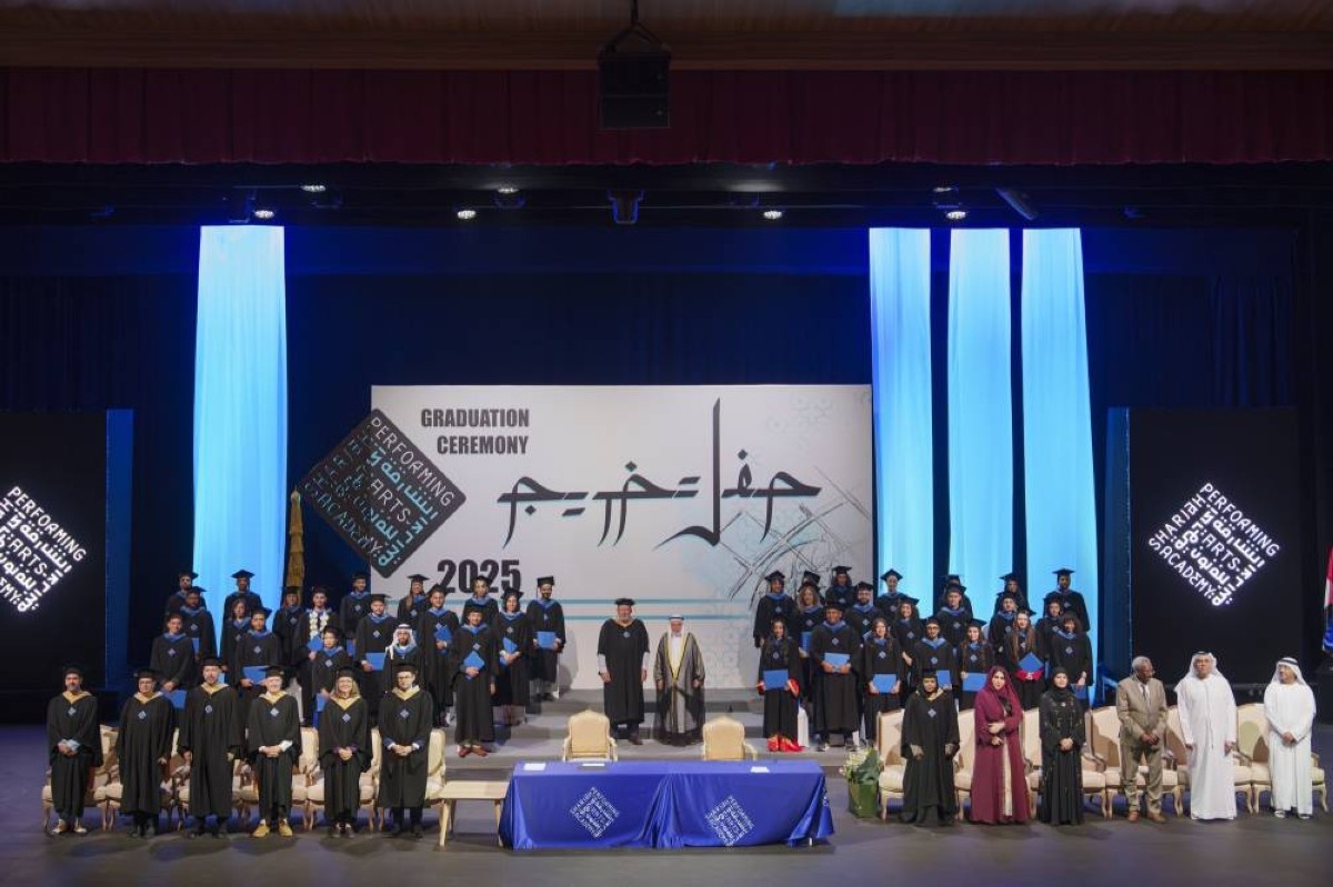 من جانبها، ألقت الفنانة زينب العسكري كلمة ضيف شرف الحفل، معبرة خلالها عن سعادتها الكبيرة لإتاحة الفرصة بالتواجد في مثل هذا الصرح الفني المميز.وتفضل صاحب السمو الشيخ الدكتور سلطان بن محمد القاسمي، بتوزيع الشهادات على الخريجين والخريجات، وسط فرحة كبيرة من أهاليهم وأولياء الأمور، ملتقطاً سموه صورة جماعية مع الخريجين.