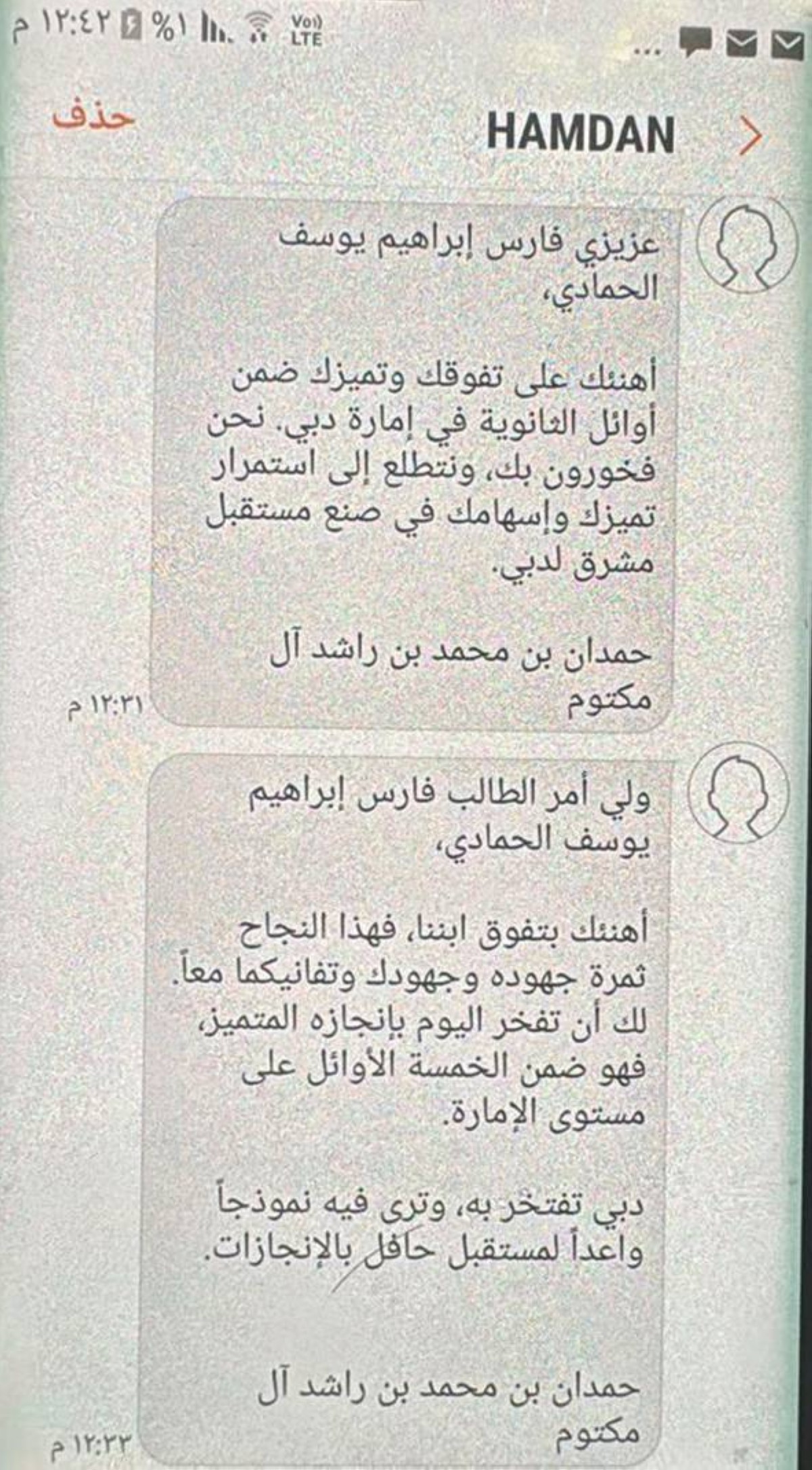 وجاء في إحدى الرسائل التي بعثها سموه للطلبة: «عزيزي فارس إبراهيم يوسف الحمادي، أهنئك على تفوقك وتميزك ضمن أوائل الثانوية في إمارة دبي. نحن فخورون بك، ونتطلع إلى استمرار تميزك وإسهامك في صنع مستقبل مشرق لدبي».
