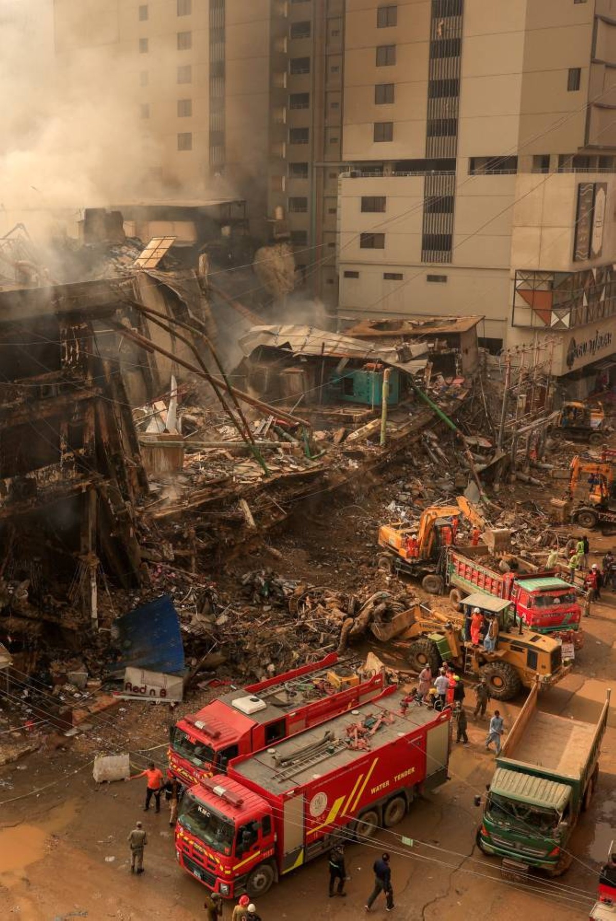 وأظهرت مقاطع الفيديو ألسنة اللهب وهي تلتهم المبنى بكامل طوابقه، وواصلت فرق الإطفاء العمل طوال الليل لإخماد الحريق. وبدأت الفرق صباحاً عملية تبريد الموقع وإزالة القطع المعدنية الملتوية والحطام المتناثر في الشارع، إضافة إلى وحدات التكييف التي تساقطت ولافتات المتاجر.