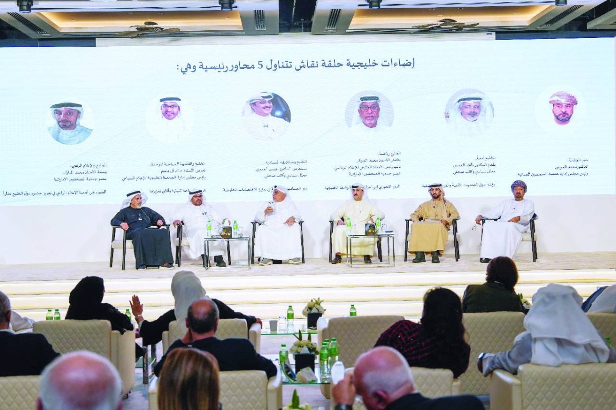 ضمن احتفالات جمعية الصحفيين بيوبيلها الفضي ومرور 25 عاماً على تأسيسها، نظمت الجمعية، صباح أمس، جلسة حوارية بعنوان «إضاءات خليجية»، بمشاركة نخبة من الإعلاميين والمختصين الخليجيين، الذين ناقشوا فرص التعاون في مجالات الأمن، والرياضة، والصناديق السيادية، والسياحة، والإعلام الرقمي، مؤكدين أهمية تعزيز وتطوير التكامل بين دول الخليج.
