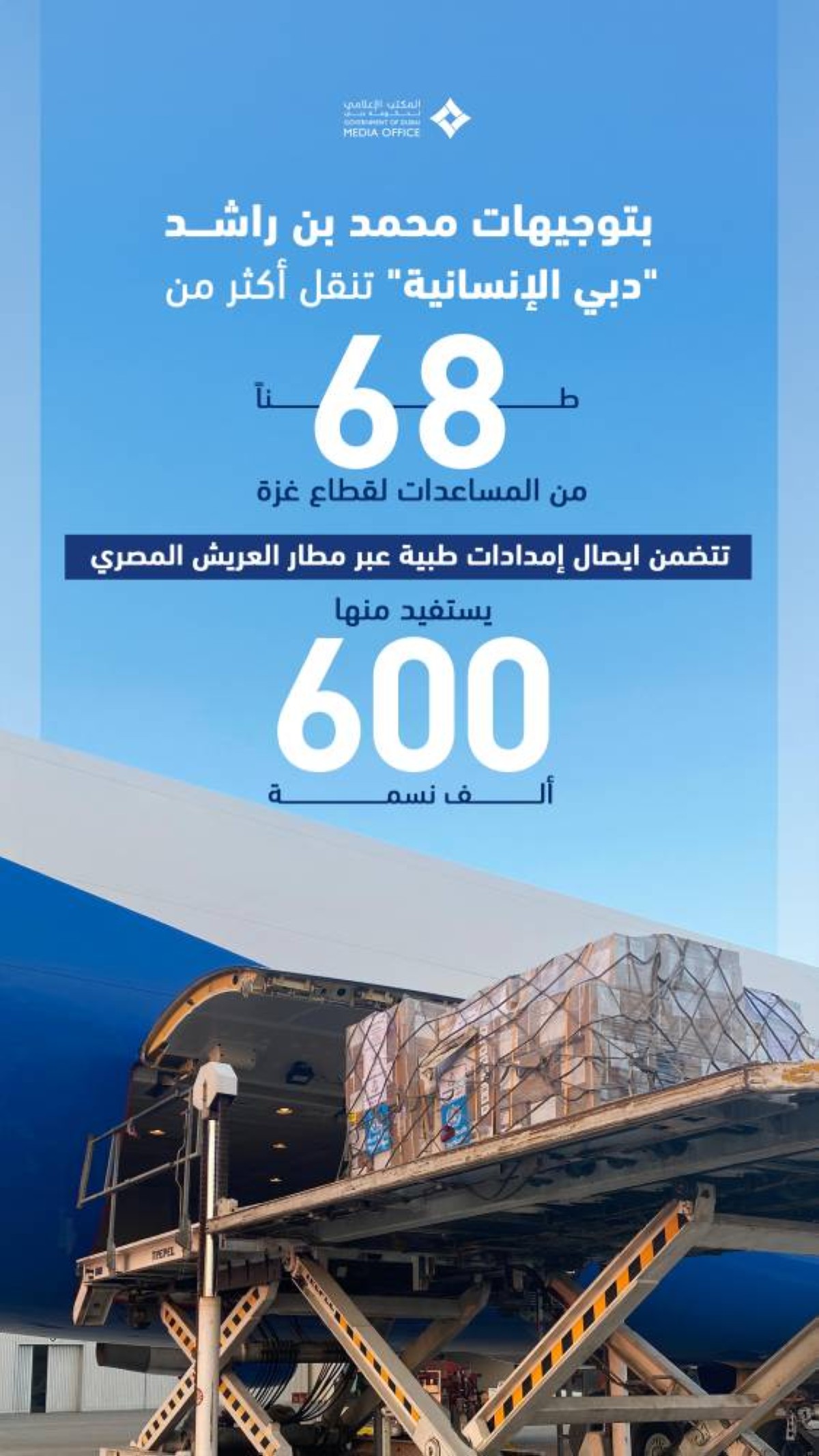 بتوجيهات صاحب السمو الشيخ محمد بن راشد آل مكتوم، نائب رئيس الدولة رئيس مجلس الوزراء حاكم دبي، رعاه الله، نقلت "دبي الإنسانية" 68.4 طن من الإمدادات الطبية العاجلة استجابةً للأزمة الإنسانية المستمرة في قطاع غزة، وذلك عبر مطار العريش المصري.