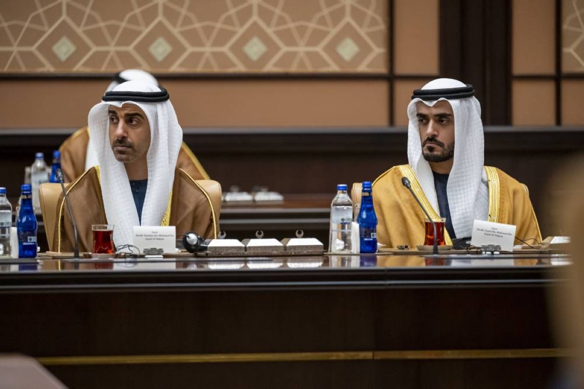 محمد بن زايد خلال الاجتماع بحضور سيف بن زايد وحمدان وزايد بن محمد بن زايد وأحمد المزروعي