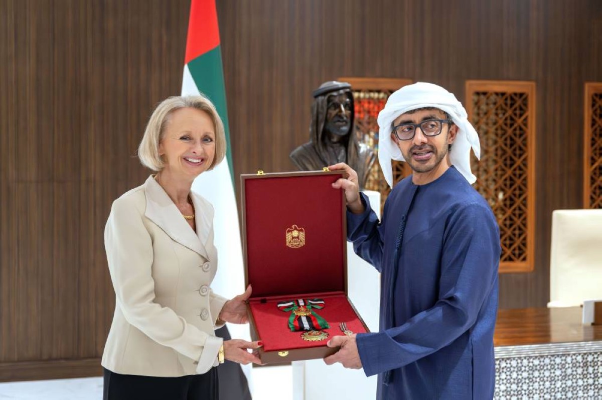 وقلد سمو الشيخ عبدالله بن زايد آل نهيان، نائب رئيس مجلس الوزراء وزير الخارجية، السفيرة الوسام، خلال استقباله لها اليوم في أبوظبي.