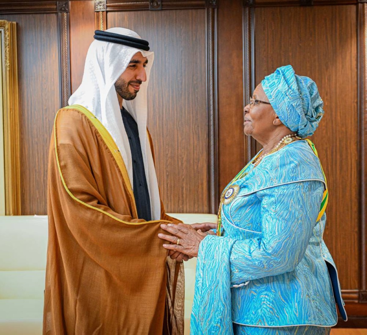 من جانبها، نقلت فخامة نيتومبو ناندي ندايتواه تحياتها إلى صاحب السمو الشيخ محمد بن زايد آل نهيان رئيس الدولة “حفظه الله” وصاحب السمو الشيخ محمد بن راشد آل مكتوم نائب رئيس الدولة رئيس مجلس الوزراء حاكم دبي “رعاه الله”، وسمو الشيخ منصور بن زايد آل نهيان نائب رئيس الدولة نائب رئيس مجلس الوزراء رئيس ديوان الرئاسة، وتمنياتها لدولة الإمارات حكومة وشعباً بالمزيد من التطور والنماء.