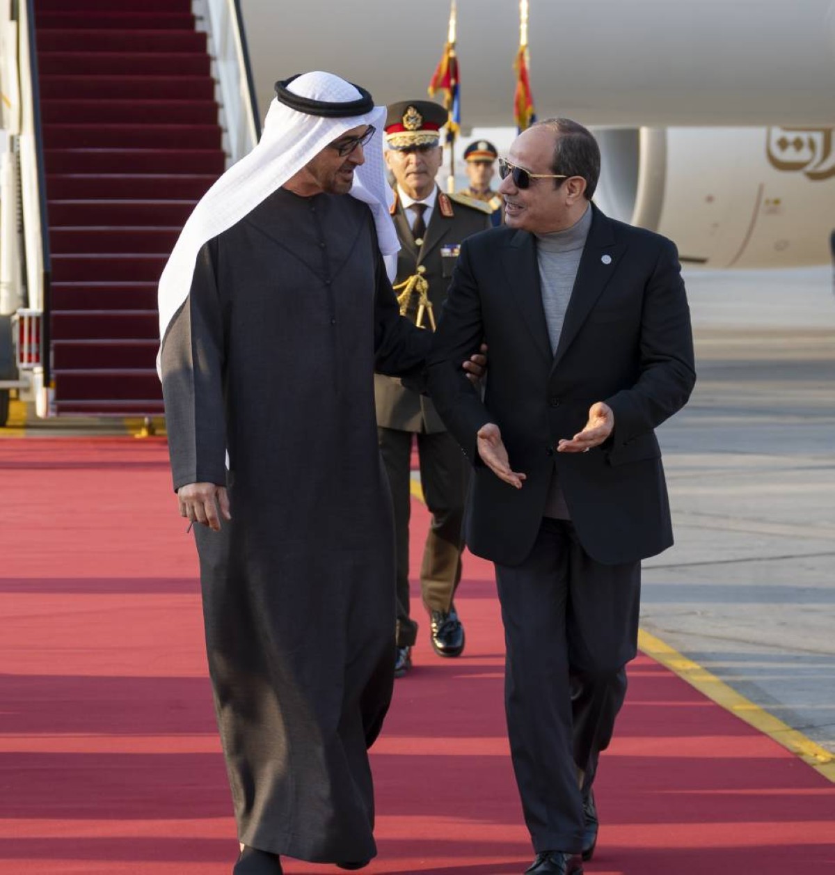 ورحب فخامة الرئيس المصري، خلال استراحة قصيرة في قاعة كبار الزوار في المطار، بصاحب السمو الشيخ محمد بن زايد آل نهيان والوفد المرافق، وتبادلا التهاني وأطيب الأمنيات فيما تبقى من شهر رمضان المبارك، والأحاديث الأخوية الودية التي تعبر عن متانة العلاقات التي تجمع البلدين الشقيقين.