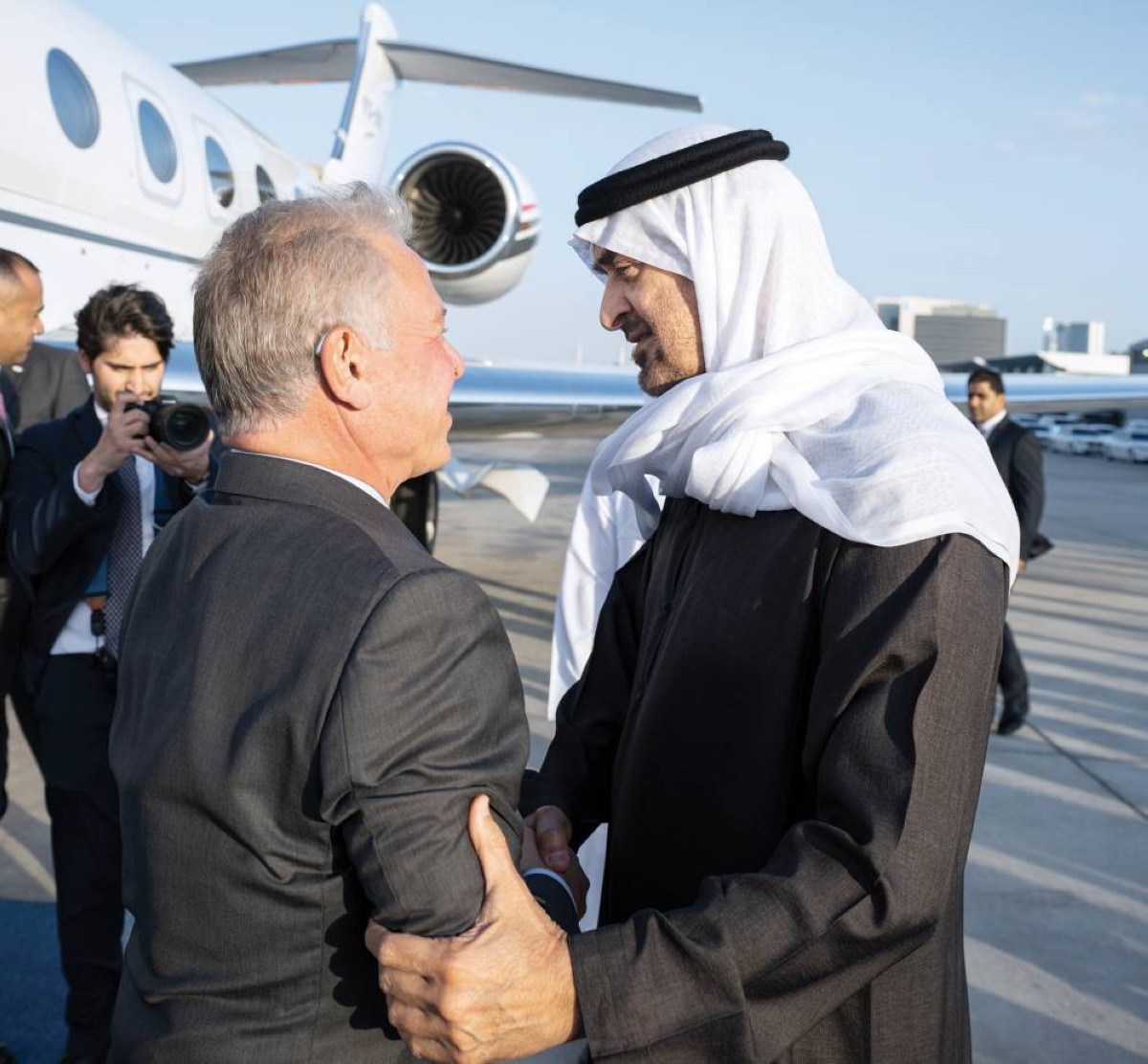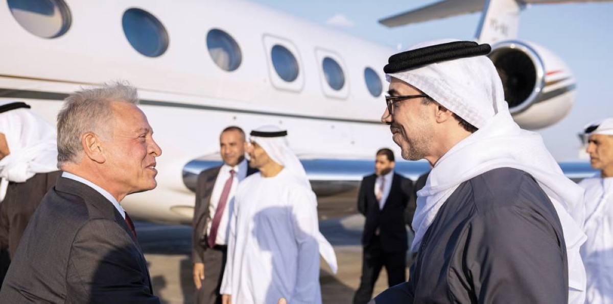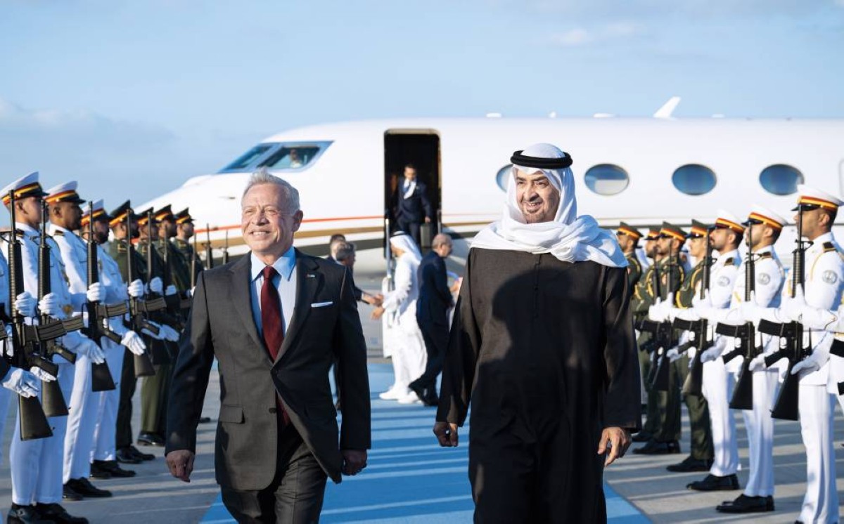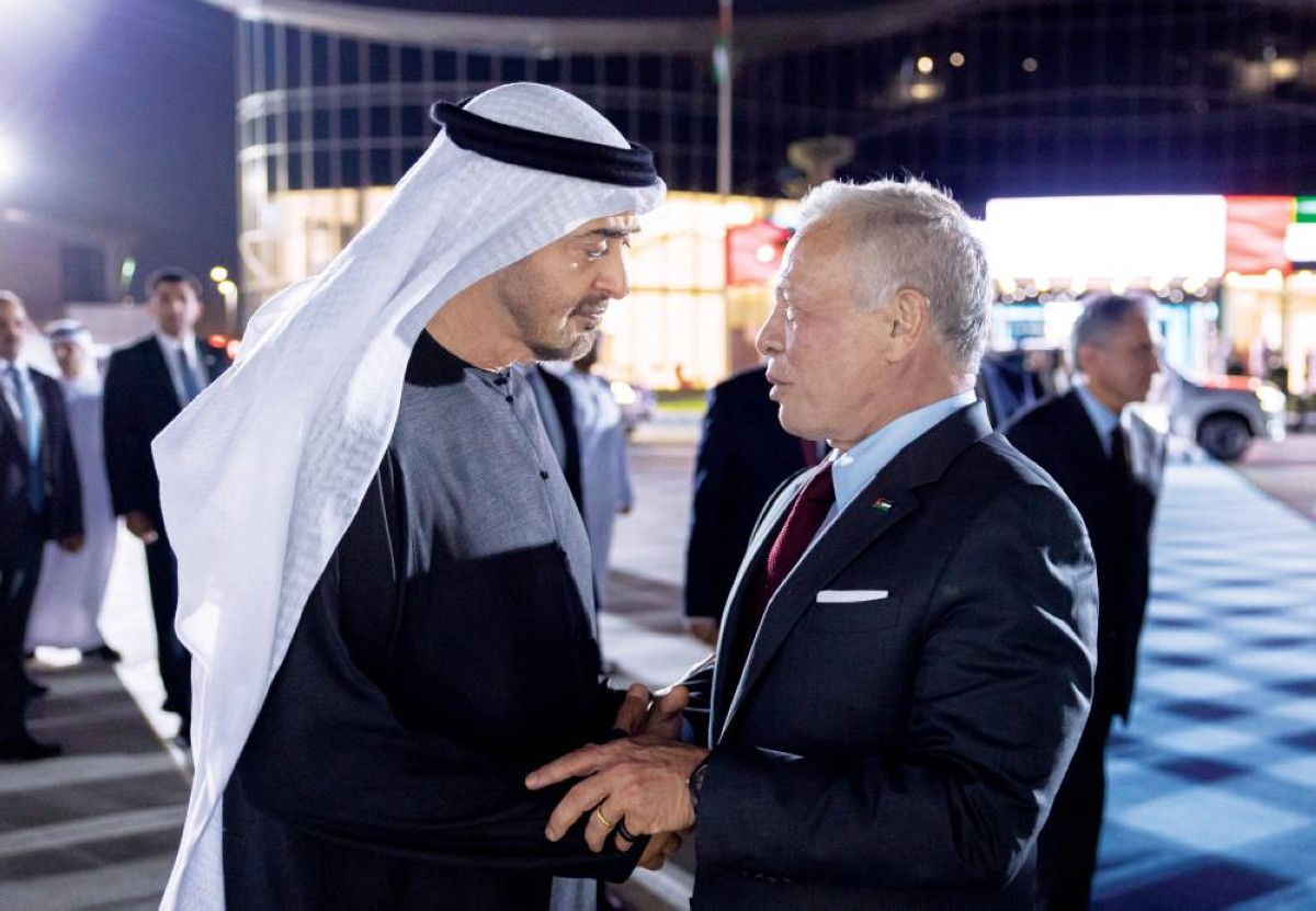 وكان صاحب السمو الشيخ محمد بن زايد آل نهيان، رئيس الدولة، حفظه الله، في مقدمة مستقبلي أخيه جلالة الملك عبدالله الثاني بن الحسين لدى وصوله، والوفد المرافق إلى مطار البطين.