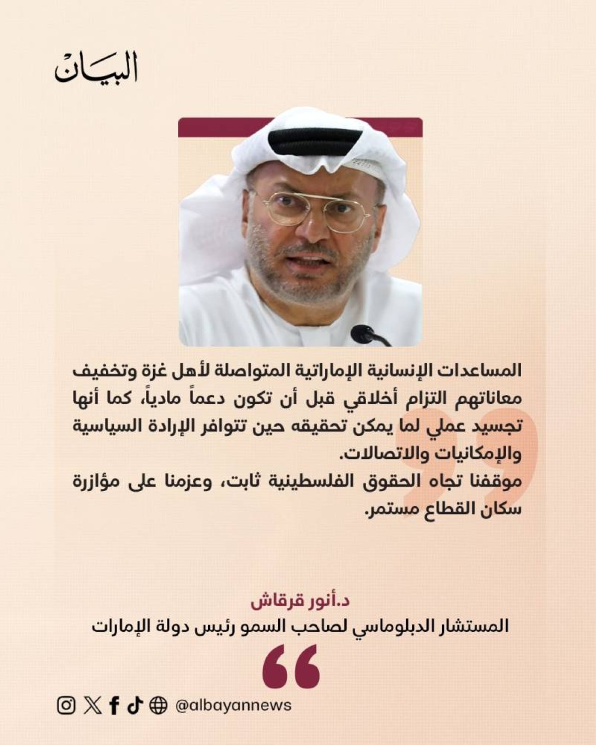 وأشار معاليه إلى أن المساعدات الإنسانية الإماراتية المتواصلة لأهل غزة وتخفيف معاناتهم التزام أخلاقي قبل أن تكون دعماً مادياً، كما أنها تجسيد عملي لما يمكن تحقيقه حين تتوافر الإرادة السياسية والإمكانيات والاتصالات.
