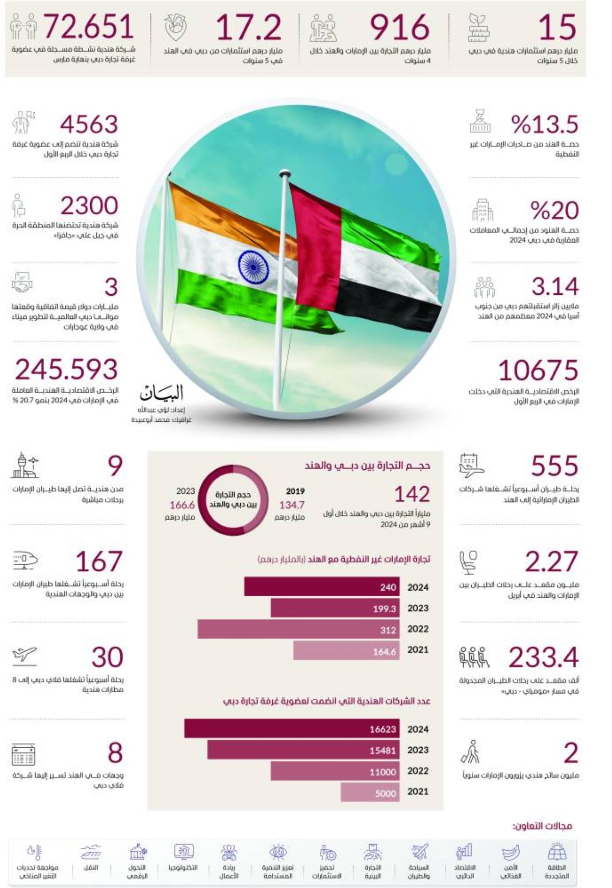 تعيش العلاقات بين الإمارات والهند عصراً من التعاون غير المسبوق، حيث تطورت لتصبح شراكة استراتيجية شاملة، تتوسع في العديد من المجالات الحيوية التي تشمل الاقتصاد، والتجارة، والطاقة المتجددة، والتحول الرقمي، وغيرها من القطاعات.