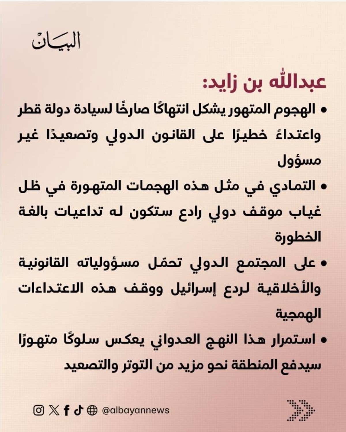 أدان سمو الشيخ عبدالله بن زايد آل نهيان نائب رئيس مجلس الوزراء وزير الخارجية، بأشد العبارات، الاعتداء الإسرائيلي السافر والجبان الذي استهدف دولة قطر الشقيقة، مؤكدا أن هذا الهجوم المتهور يشكل انتهاكًا صارخًا لسيادة دولة قطر، واعتداءً خطيرًا على القانون الدولي وميثاق الأمم المتحدة، وتصعيدًا غير مسؤول يهدد الأمن والاستقرار الإقليمي والدولي.
