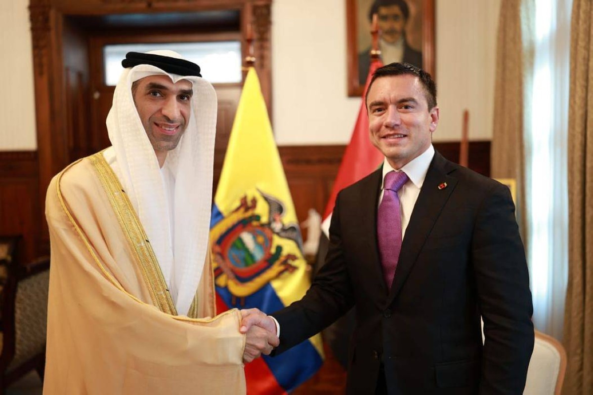من جانبه، حمل فخامة دانيال نوبوا رئيس جمهورية الأكوادور معالي ثاني الزيودي تحياته إلى صاحب السمو الشيخ محمد بن زايد آل نهيان رئيس الدولة "حفظه الله"، وصاحب السمو الشيخ محمد بن راشد آل مكتوم نائب رئيس الدولة رئيس مجلس الوزراء حاكم دبي "رعاه الله"، وسمو الشيخ منصور بن زايد آل نهيان نائب رئيس الدولة نائب رئيس مجلس الوزراء رئيس ديوان الرئاسة.