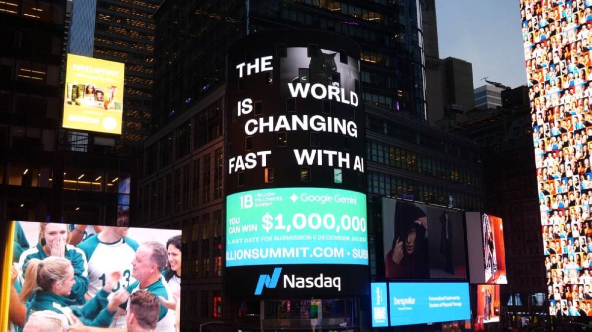 أضاء إعلان جائزة الأفلام المولدة بالذكاء الاصطناعي، التي تنظمها قمة المليار متابع بالتعاون مع Google Gemini، الواجهة الشهيرة لبرج بورصة ناسداك في ميدان تايمز سكوير، بحي مانهاتن الشهير في مدينة نيويورك.
