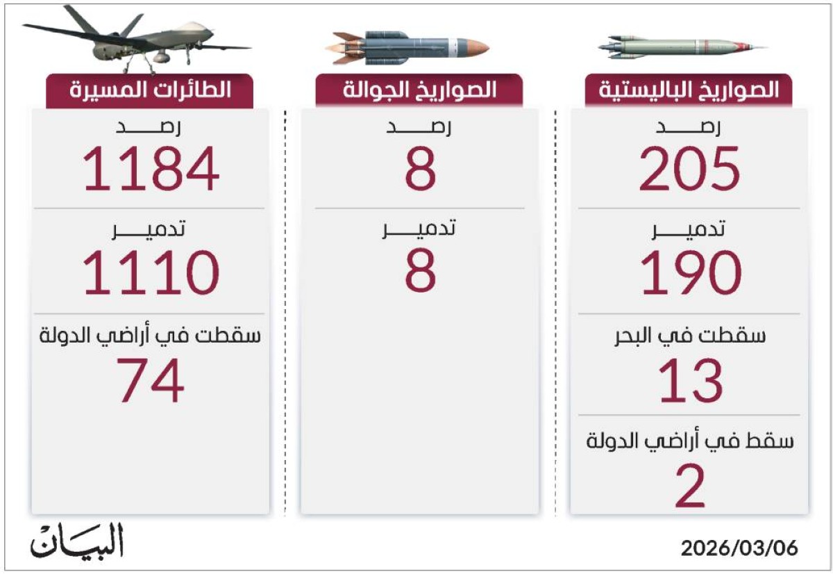 حيث تم تدمير 190 صاروخاً باليستياً، فيما سقط 13 منها في مياه البحر، وسقط عدد (2 صاروخ) داخل أراضي الدولة، كما تم رصد 1184 طائرة مسيّرة إيرانية واعتراض 1110 منها، فيما سقطت 74 طائرة مسيّرة داخل أراضي الدولة.
