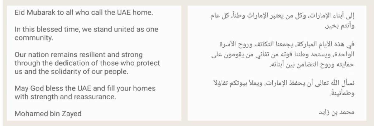 مشيراً إلى أن هذه الرسالة الكريمة لا تحمل فقط التهنئة بمناسبة عيد الفطر السعيد، بل تؤكد أيضاً القيم الراسخة التي قامت عليها دولة الإمارات، من وحدة وتراحم وتضامن وشعور عميق بالمسؤولية المشتركة تجاه الوطن والمجتمع.