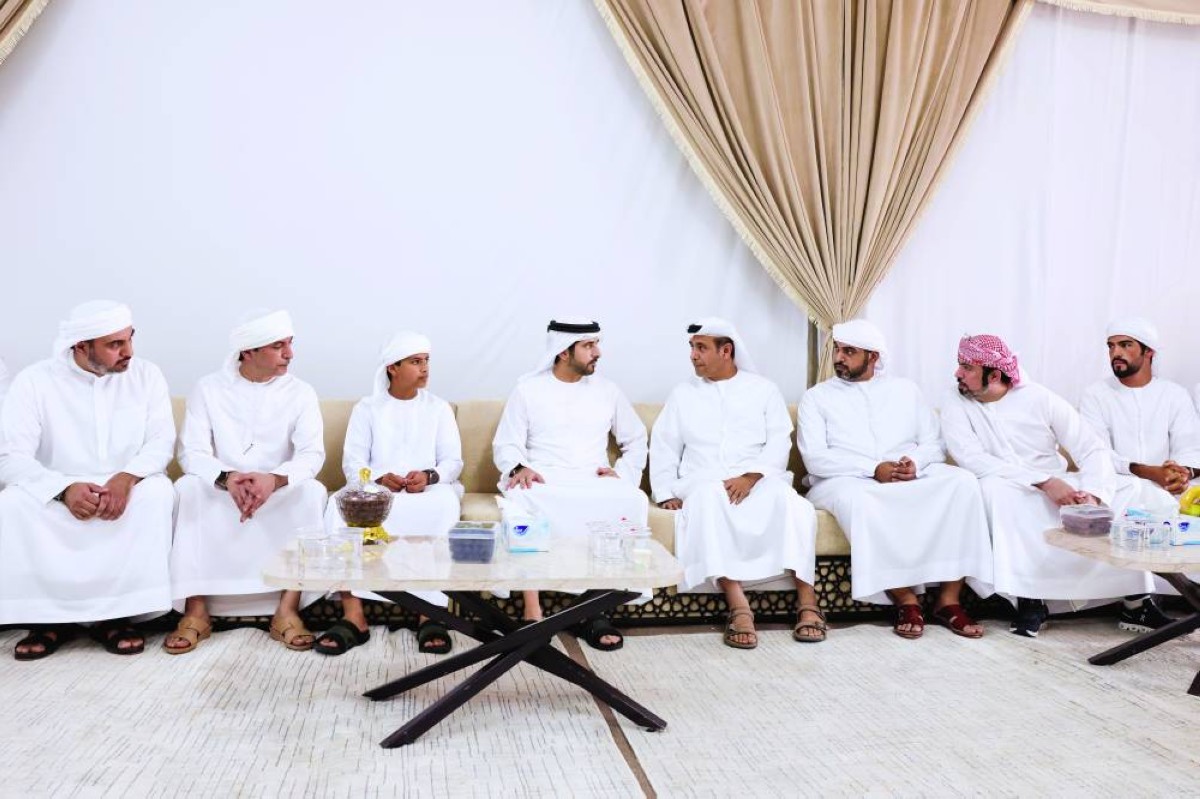 حمدان بن محمد خلال تقديم واجب العزاء إلى محمد مبارك المنصوري