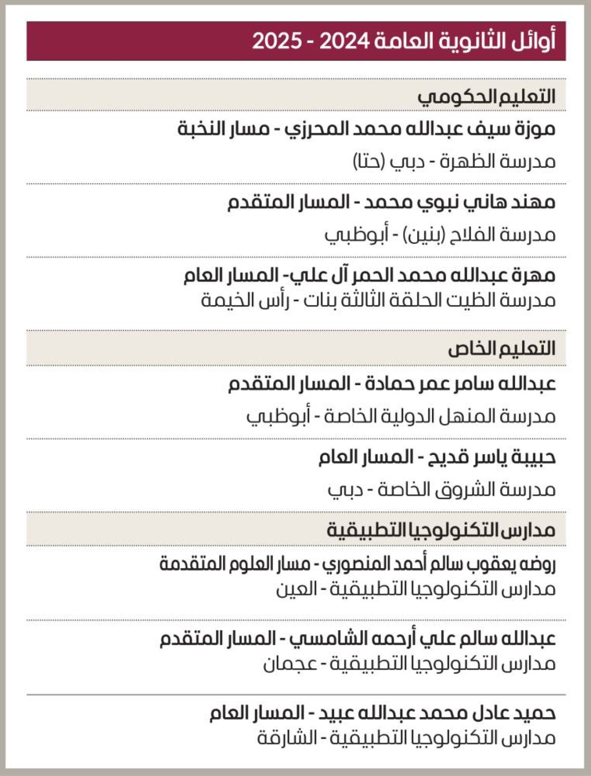 وأعلن سموه عن قائمة الأوائل في الثانوية العامة على مستوى الدولة، ففي التعليم الحكومي، جاءت الطالبة موزة سيف عبد الله محمد المحرزي ضمن (مسار النخبة)، من مدرسة الظهرة في إمارة دبي، والطالب مهند هاني نبوي محمد ضمن (المسار المتقدم)، من مدرسة الفلاح – بنين من إمارة أبوظبي، والطالبة مهرة عبد الله محمد الحمر آل علي (المسار العام)، من مدرسة الظيت – الحلقة الثالثة بنات في رأس الخيمة، ضمن المركز الأول.