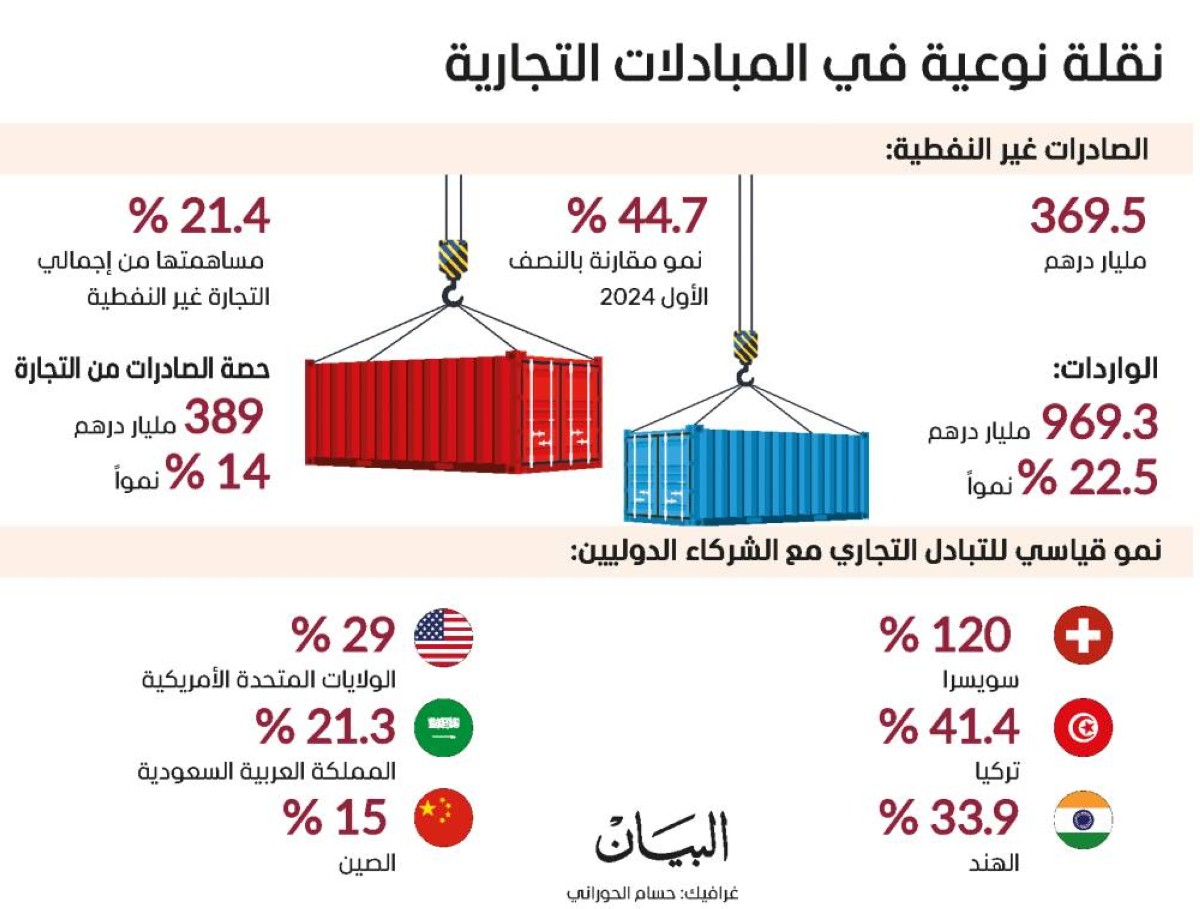 وبنمو 24.5% على أساس سنوي، مقارنة مع النصف الأول من 2024، كما استمر النمو على أساس نصف سنوي 9.1%، مقارنة مع النصف الثاني من 2024، الذي كان عاماً استثنائياً بالنسبة للتجارة الخارجية غير النفطية للدولة.