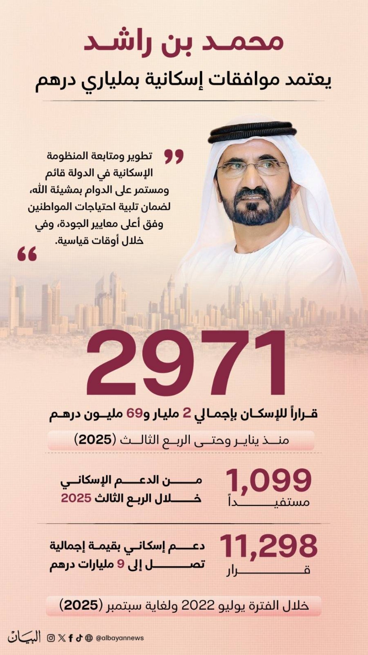 أكد صاحب السمو الشيخ محمد بن راشد آل مكتوم، نائب رئيس الدولة، رئيس مجلس الوزراء حاكم دبي، "رعاه الله"، أن دولة الإمارات بقيادة صاحب السمو الشيخ محمد بن زايد آل نهيان، رئيس الدولة، "حفظه الله"، تولي ملف إسكان المواطنين أولوية رئيسية عبر التطوير المستمر للمنظومة الإسكانية، وبما يلبي احتياجات المواطنين وفق أعلى معايير الجودة، وفي خلال أوقات قياسية تتناسب مع الدور المهم الذي يمثله السكن الملائم كأحد أبرز عوامل استقرار الأسرة المواطنة.