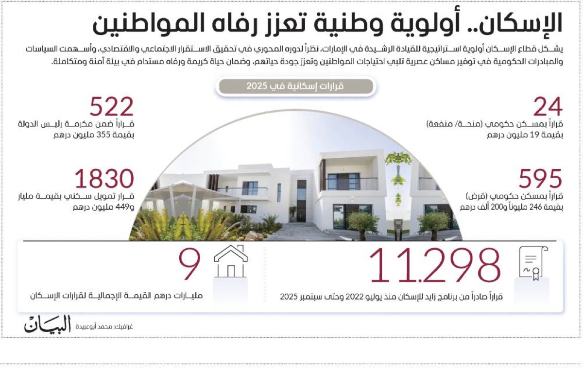يذكر أنه وصل عدد القرارات الصادرة من برنامج زايد للإسكان منذ يوليو 2022، وحتى سبتمبر 2025، 11,298 قراراً، بقيمة إجمالية تصل إلى ما يقارب 9 مليارات درهم.