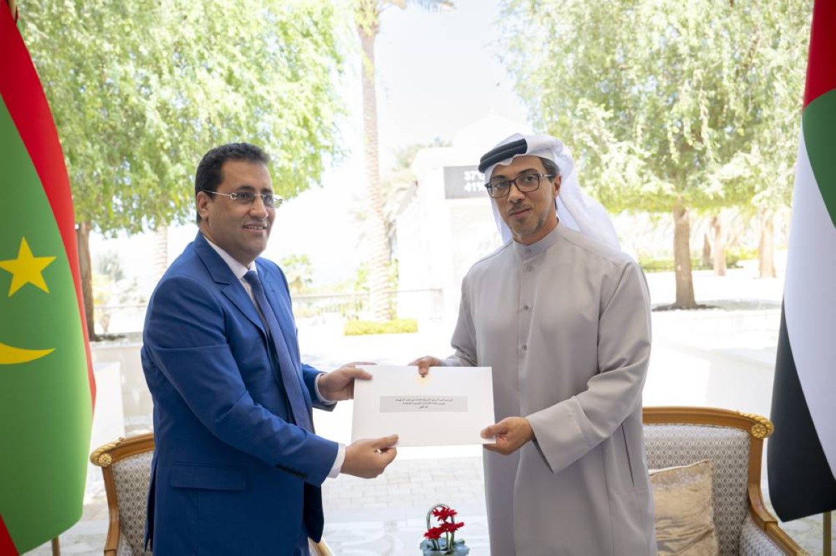 تسلم الرسالة سمو الشيخ منصور بن زايد آل نهيان، نائب رئيس الدولة نائب رئيس مجلس الوزراء رئيس ديوان الرئاسة خلال استقباله، في قصر الوطن بأبوظبي، معالي المختار ولد أجاي رئيس الوزراء الموريتاني.