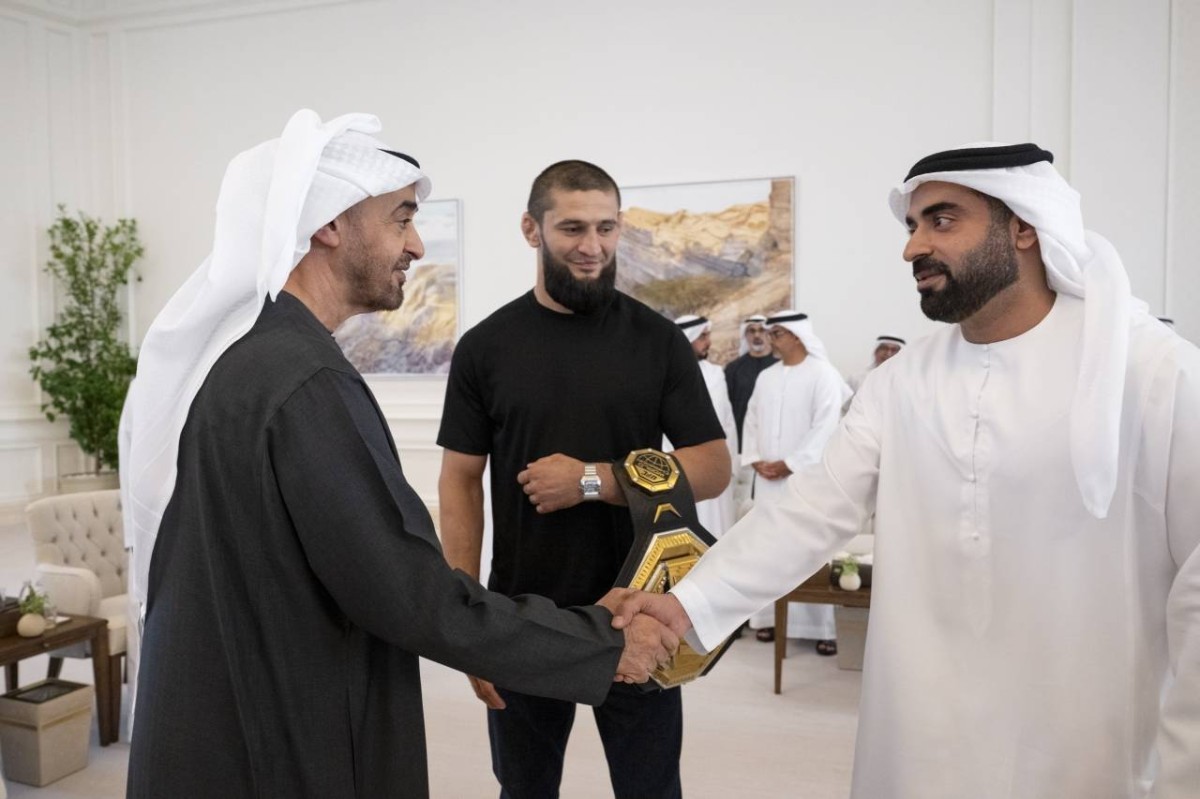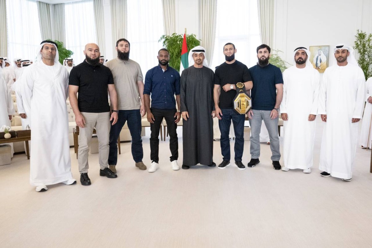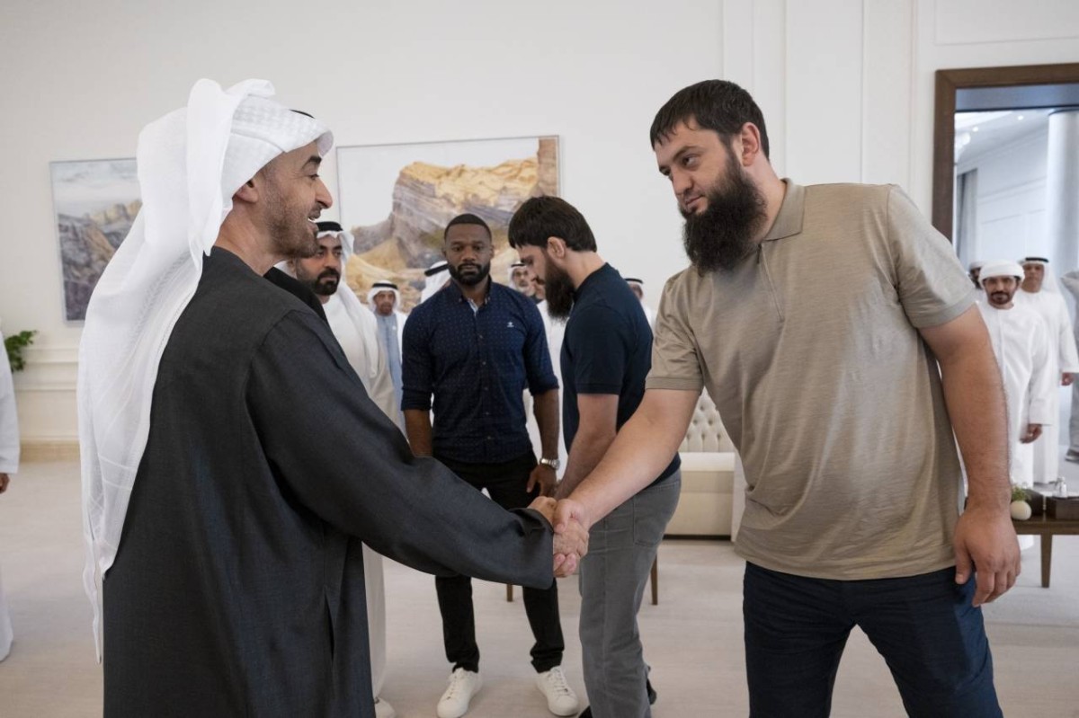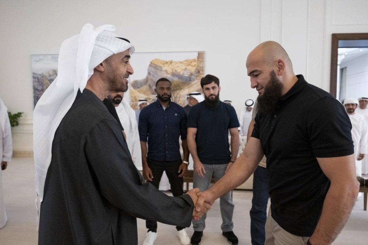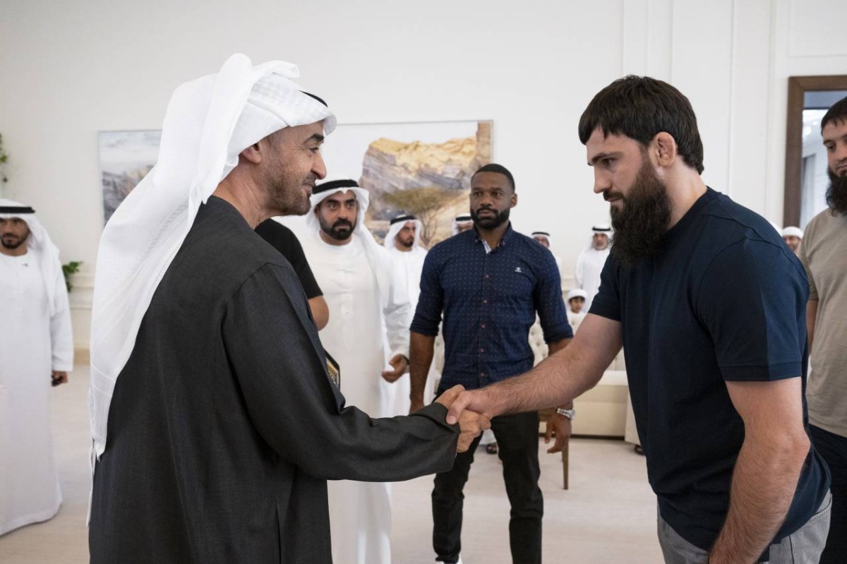 استقبل صاحب السمو الشيخ محمد بن زايد آل نهيان، رئيس الدولة، حفظه الله، حمزة شيماييف، الفائز ببطولة العالم للوزن المتوسط «يو إف سي»، التي أُقيمت مؤخراً في مدينة شيكاغو الأمريكية.