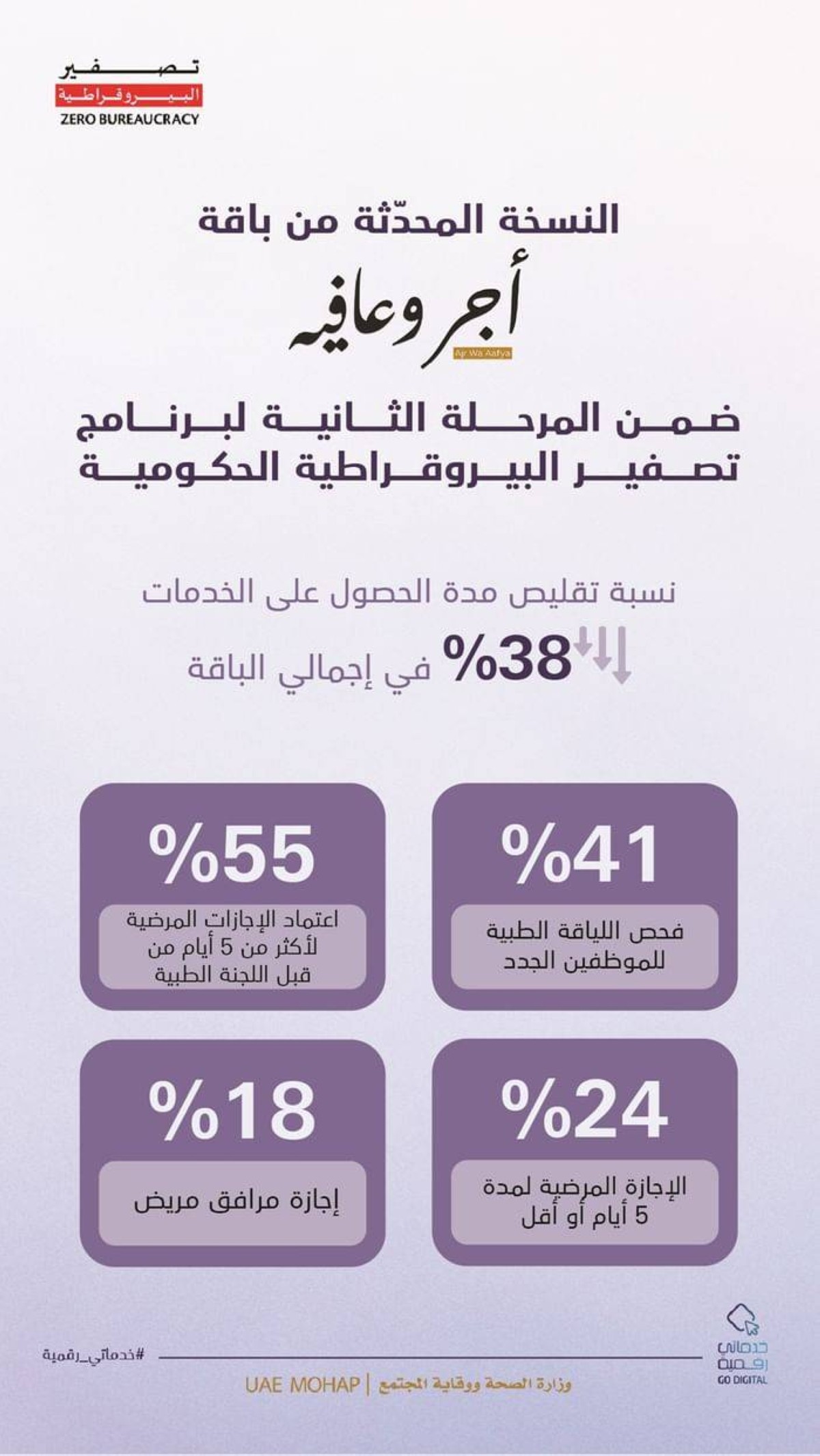 وتشكل باقة «أجر وعافية» انعكاساً لنهج حكومة دولة الإمارات في تقدير جهود موظفيها وحرصها على تهيئة بيئة عمل محفزة، تسهم في رفع الإنتاجية، وتعزيز جودة الحياة الوظيفية، من خلال اختصار زمن إنجاز خدمات الإجازات المرضية، لتكون سهلة وسريعة وخالية من التعقيدات.