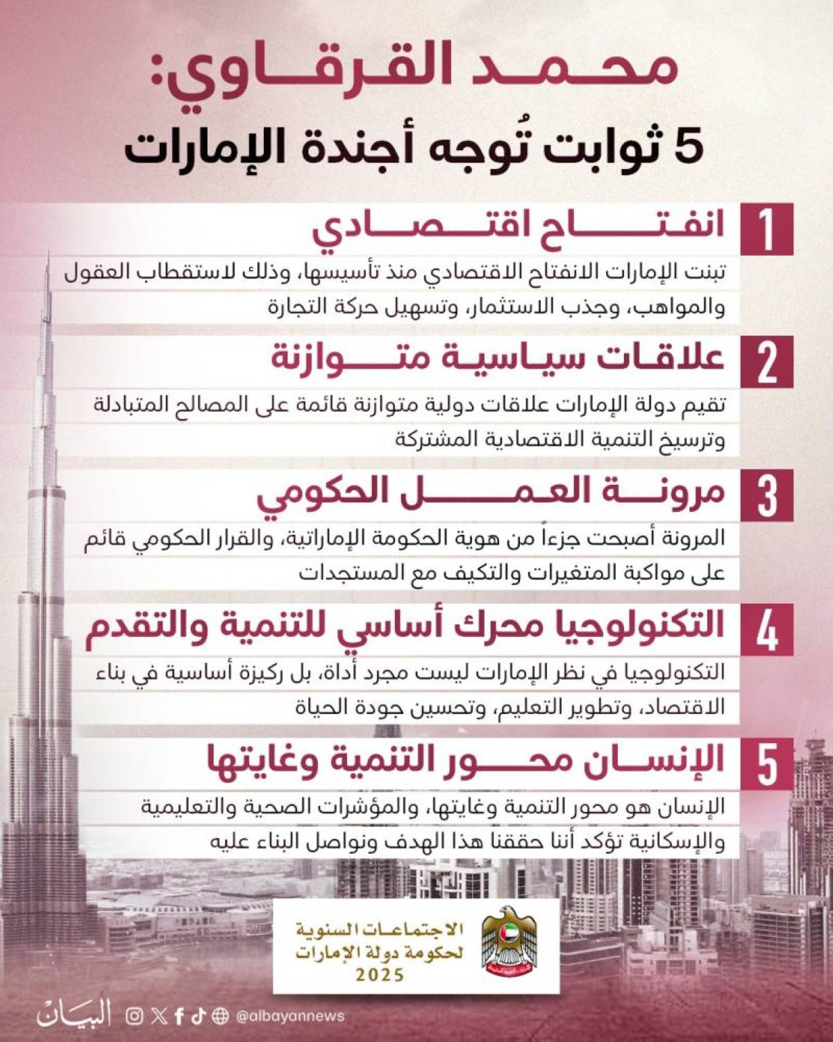 وبين معالي محمد القرقاوي أن دولة الإمارات مستمرة على هذه الثوابت: الانفتاح على العالم وعلى الشعوب هو نهجنا. التوازن السياسي والمرونة في قرارات الحكومة بما يخدم مسيرة التنمية. الرهان على الابتكار والتكنولوجيا كمحرك أساسي. والنهج الأهم هو التركيز على الإنسان. ثوابتنا واضحة، ورؤيتنا راسخة، وقيادتنا لا تعرف المستحيل.