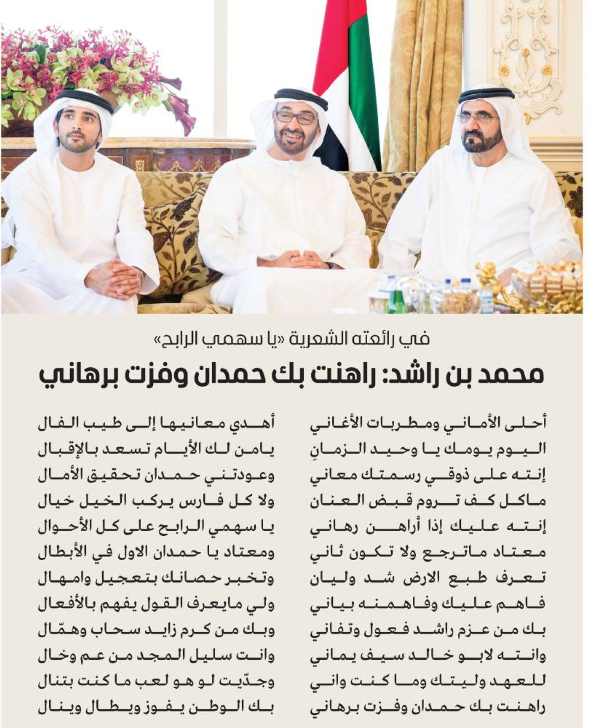 أهدى صاحب السمو الشيخ محمد بن راشد آل مكتوم نائب رئيس الدولة رئيس مجلس الوزراء حاكم دبي، رعاه الله، رائعة شعرية، إلى سمو الشيخ حمدان بن محمد بن راشد آل مكتوم ولي عهد دبي، نائب رئيس مجلس الوزراء، وزير الدفاع. ونشر صاحب السمو الشيخ محمد بن راشد آل مكتوم، فيديو للرائعة الشعرية، مغنّاة، عبر منصة «X»، أرفقها سموه بتدوينة، قال فيها: «إلى حمدان بن محمد بن راشد آل مكتوم.. أهديك أطيب المعاني والأماني».