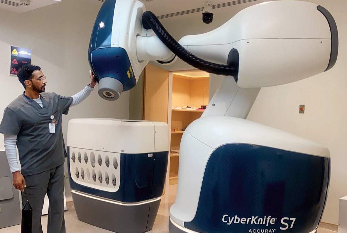 وأفاد الدكتور عبدالرحمن سليمان بن سميدع، المدير الطبي للعلاج الإشعاعي في مركز الأورام بمستشفى توام، بأن ما يميز المركز احتواءه على جهاز CyberKnife، وهو تقنية متطورة، ونظام جراحي إشعاعي روبوتي متطور، كما يقدم علاجاً إشعاعياً بدقة عالية تصل إلى أقل من المليمتر، والقدرة على معالجة الأهداف المتحركة، بمعنى أنه يعالج الأورام المتحركة، مثل تلك التي تتأثر بالتنفس، كما أن الجهاز يلغي الحاجة إلى تثبيت المريض أو استخدام تقنيات حبس النفس، وحماية الأنسجة السليمة، بحيث يقلل من الضرر على الأنسجة السليمة المحيطة، ويوفر خيار علاج غير جراحي للأورام المعقدة وصعبة الوصول، ومناسباً لعلاج الأورام في الدماغ، والعمود الفقري، والرئتين، وأكثر، وتُقدر قيمة الجهاز 30 مليون درهم.
