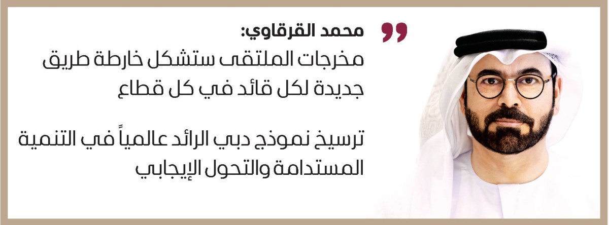 واستثمار التكنولوجيا في تحقيق جودة حياة استثنائية.. مخرجات هذا الملتقى، الذي يستلهم فكر سموه القيادي، ستشكل خارطة طريق جديدة لكل قائد في كل قطاع وفي كل مؤسسة، لضمان استمرار مسيرة التميز وتعزيز نموذج دبي الرائد عالمياً في التنمية المستدامة والتحول الإيجابي».
