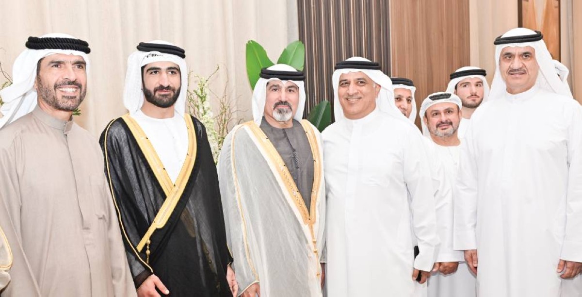 سالم بن سلطان القاسمي ومحمد القرقاوي وأنور قرقاش وخلفان بلهول والعريس وذووه وجانب من الحضور