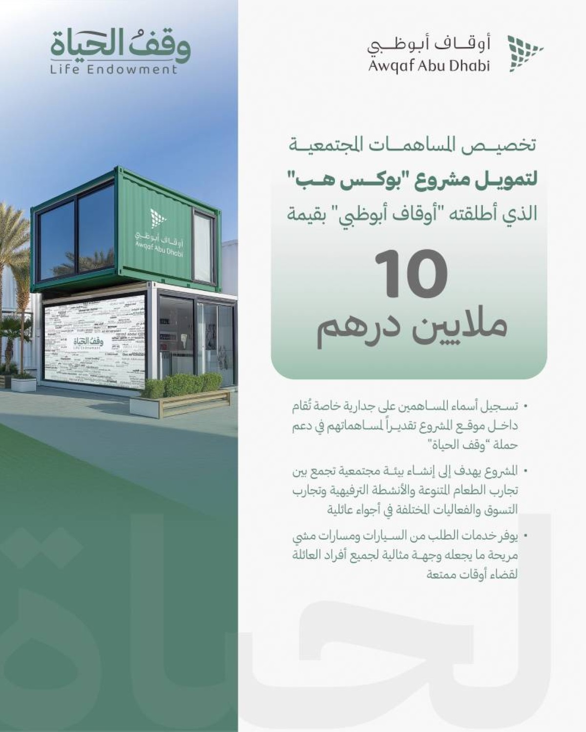 وستخصص «أوقاف أبوظبي» هذه المساهمات لتمويل مشروع «بوكس هب» الوقفي في أبوظبي الذي أطلقته الهيئة بقيمة 10 ملايين درهم لدعم حملة «وقف الحياة»، وذلك ضمن جهودها المستمرة لتعزيز المبادرات الوقفية وترسيخ أثرها الاجتماعي والإنساني.