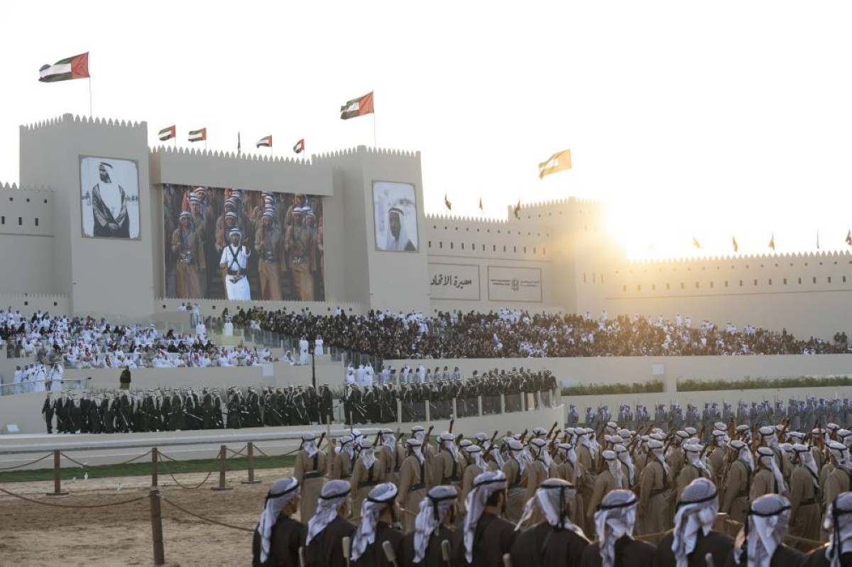 رئيس الدولة ومنصور بن زايد والرئيس الموريتاني ورئيس مالاوي وخالد بن محمد وولي عهد البحرين وحمدان وهزاع بن زايد وولي عهد رأس الخيمة وسيف وسرور بن محمد وعمر بن زايد خلال حضورهم مسيرة الاتحاد