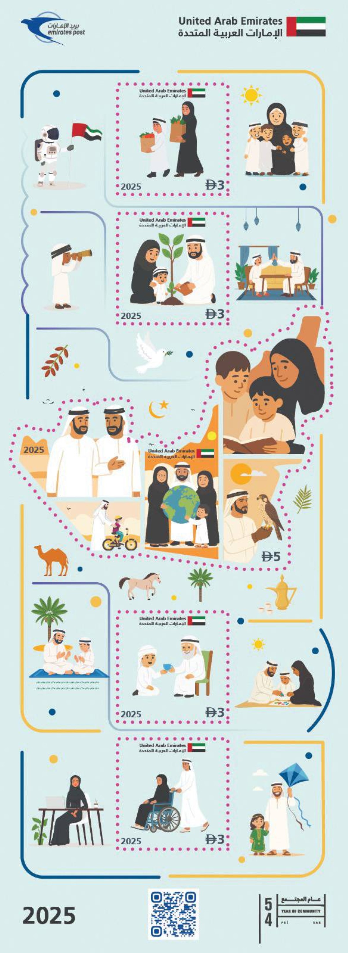 أعلن بريد الإمارات، المشغّل الرسمي لخدمات البريد في دولة الإمارات، عن إصدار مجموعة من الطوابع التذكارية بعنوان «عام المجتمع»، انسجاماً مع إعلان القيادة الرشيدة، تخصيص عام 2025 ليكون «عام المجتمع» تحت شعار «يداً بيد»، وتوثيقاً للقيم التي تجسدها المبادرة والرامية إلى ترسيخ التلاحم الاجتماعي وتعزيز روح المسؤولية المشتركة بين جميع من يعيش على أرض الإمارات.