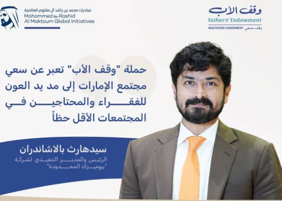 وأعرب سيدهارث بالاشاندران الرئيس والمدير التنفيذي لشركة "بيوميرك المحدودة"، عن فخره بالمساهمة في حملة “وقف الأب” التي أطلقها صاحب السمو الشيخ محمد بن راشد آل مكتوم، والتي تعبر عن ثقافة البذل والعطاء الراسخة في مجتمع الإمارات، وسعي أفراده الدائم إلى مد يد العون إلى الفقراء والمحتاجين في المجتمعات الأقل حظاً حول العالم، وتلبية احتياجاتهم في الحياة الكريمة وتوفير الرعاية الصحية المستدامة.