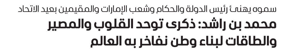 «شعب دولة الإمارات العزيز والمقيمين على أرضها، أبارك لكم عيد الاتحاد الرابع والخمسين، وأدعو الله تعالى أن يديم علينا الرخاء والازدهار، وأن تظل بلادنا بعطائنا وجهودنا جميعاً وتماسك أسرنا وقوة مجتمعنا عزيزة متقدمة ملهمة على الدوام. شكراً لكم على جهودكم المخلصة في خدمة الإمارات والإسهام في تقدمها ونهضتها، وكل عام وأنتم وأرض زايد الخير بخير».