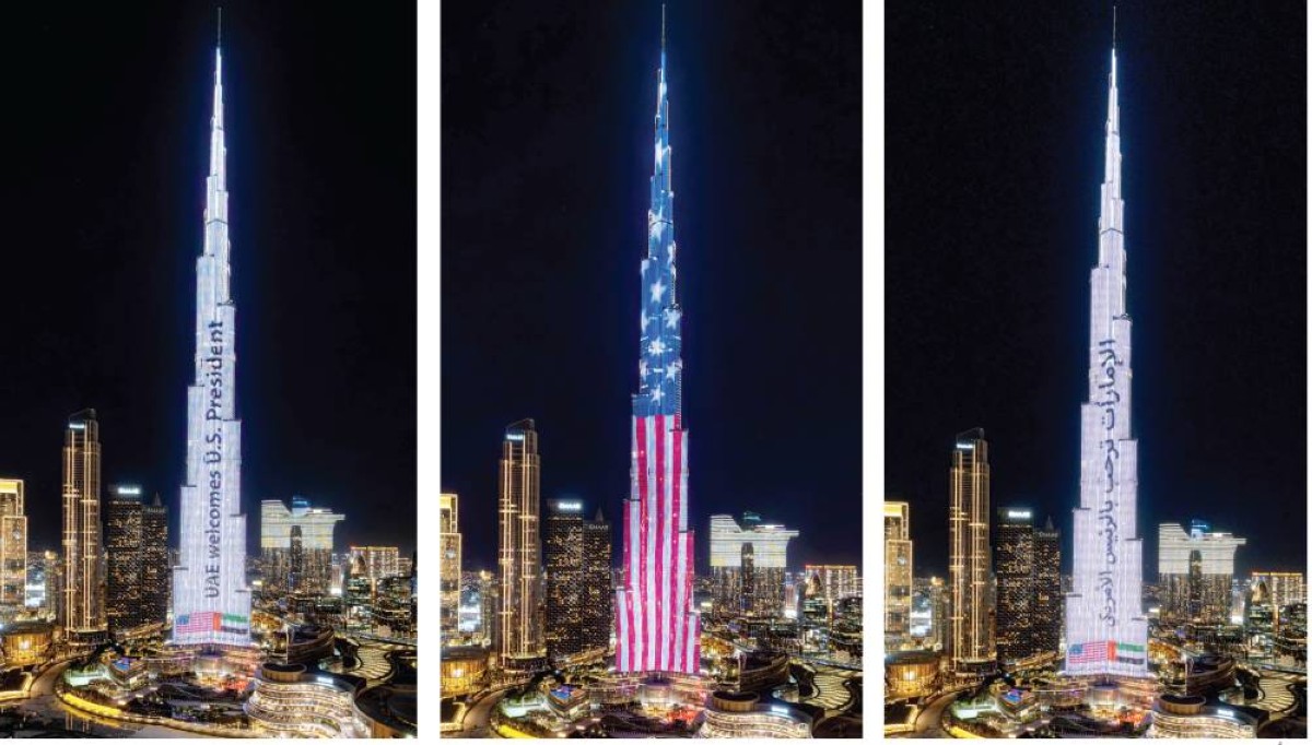 ترحيباً بقدوم ضيف البلاد الرئيس الأمريكي دونالد ترامب إلى دولة الإمارات العربية المتحدة احتفى برج خليفة بالحدث من خلال إضاءة البرج بعبارات ترحيبية، وكذلك بالعلم الأمريكي.
