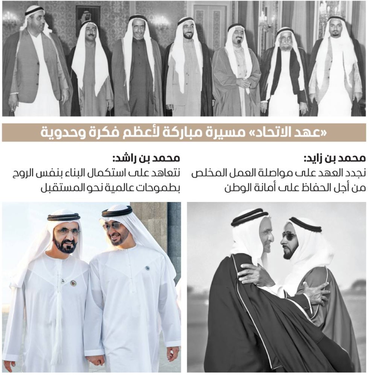 كما أكد صاحب السمو الشيخ محمد بن راشد آل مكتوم، نائب رئيس الدولة رئيس مجلس الوزراء حاكم دبي، رعاه الله، أن عهد الاتحاد يوم توافق فيه المؤسسون على وثيقة ودستور الاتحاد وتوافقت القلوب على فكرة الاتحاد.. ونتعاهد اليوم على استكمال البناء بنفس الروح وبنفس العزم وبطموحات عالمية نحو المستقبل.